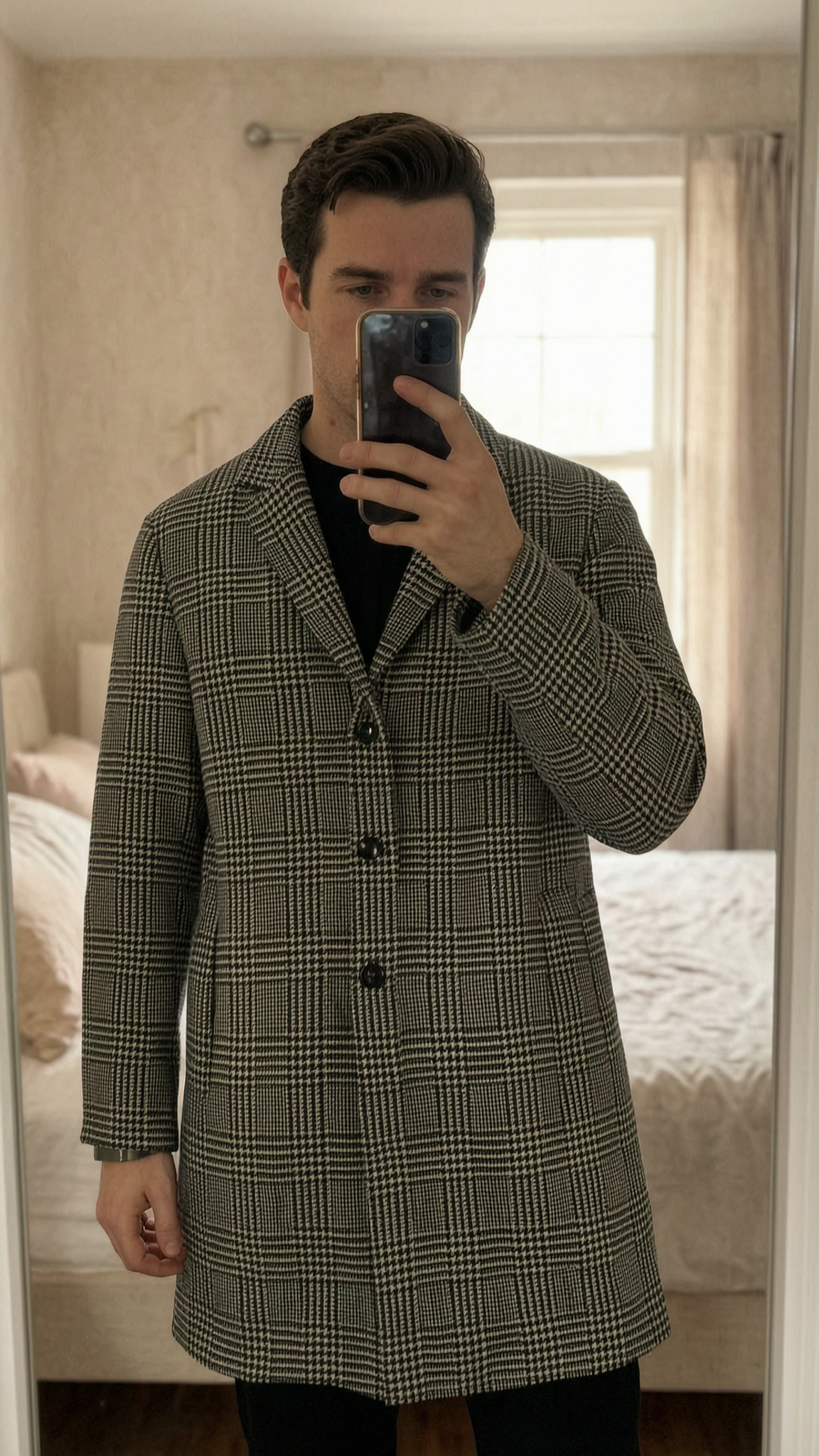 Men's Reiss Black & White Check 80% Wool Blend Coat – Size XL standing straight facing the camera, in a softly lit bedroom setting, with gentle natural light filtering through a window.