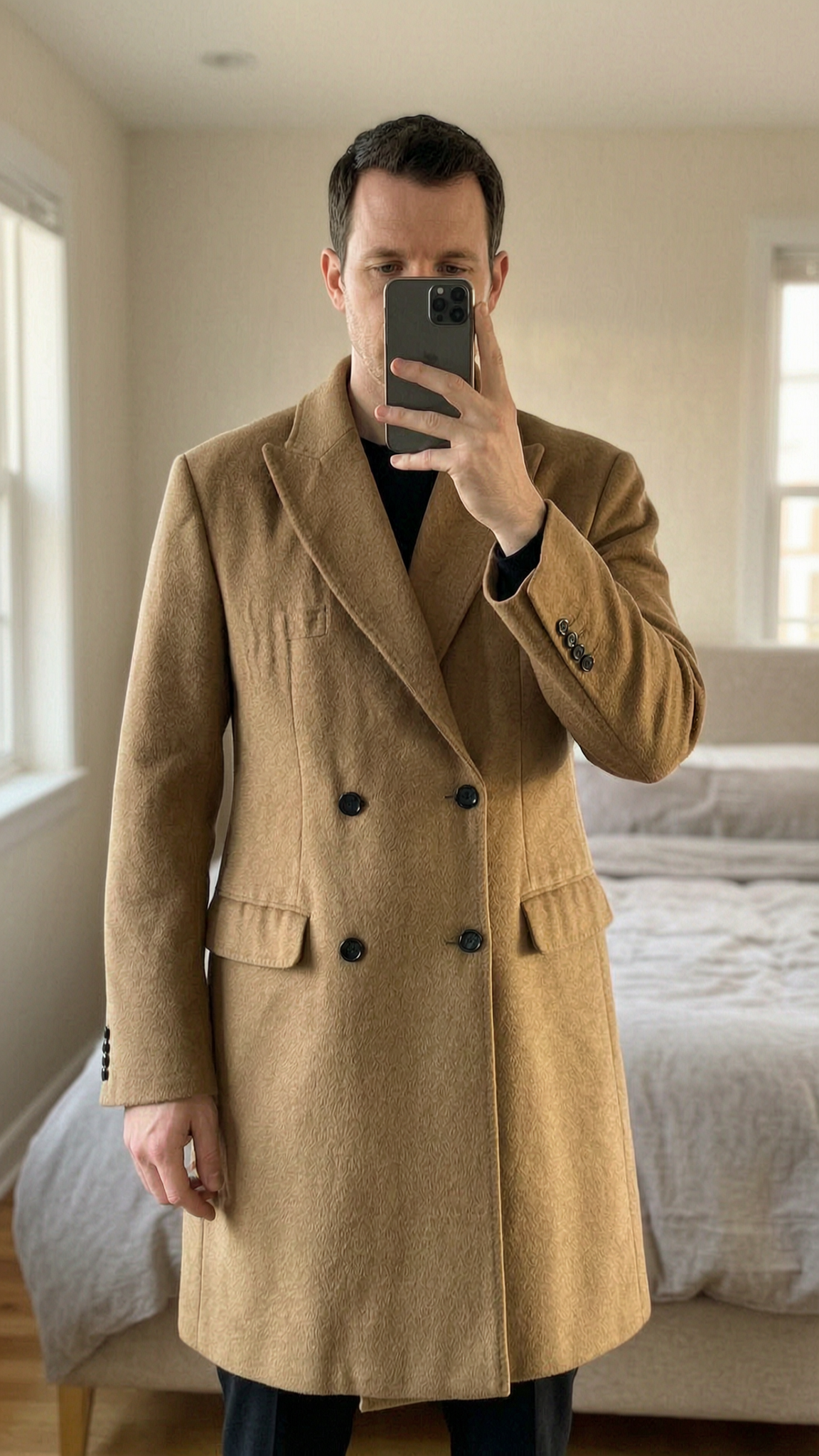 Men's Reiss Camel Double-Breasted 86% Wool Blend Coat - Size XL - Great Condition standing straight facing the camera, in a softly lit bedroom setting, with gentle natural light filtering through a window.