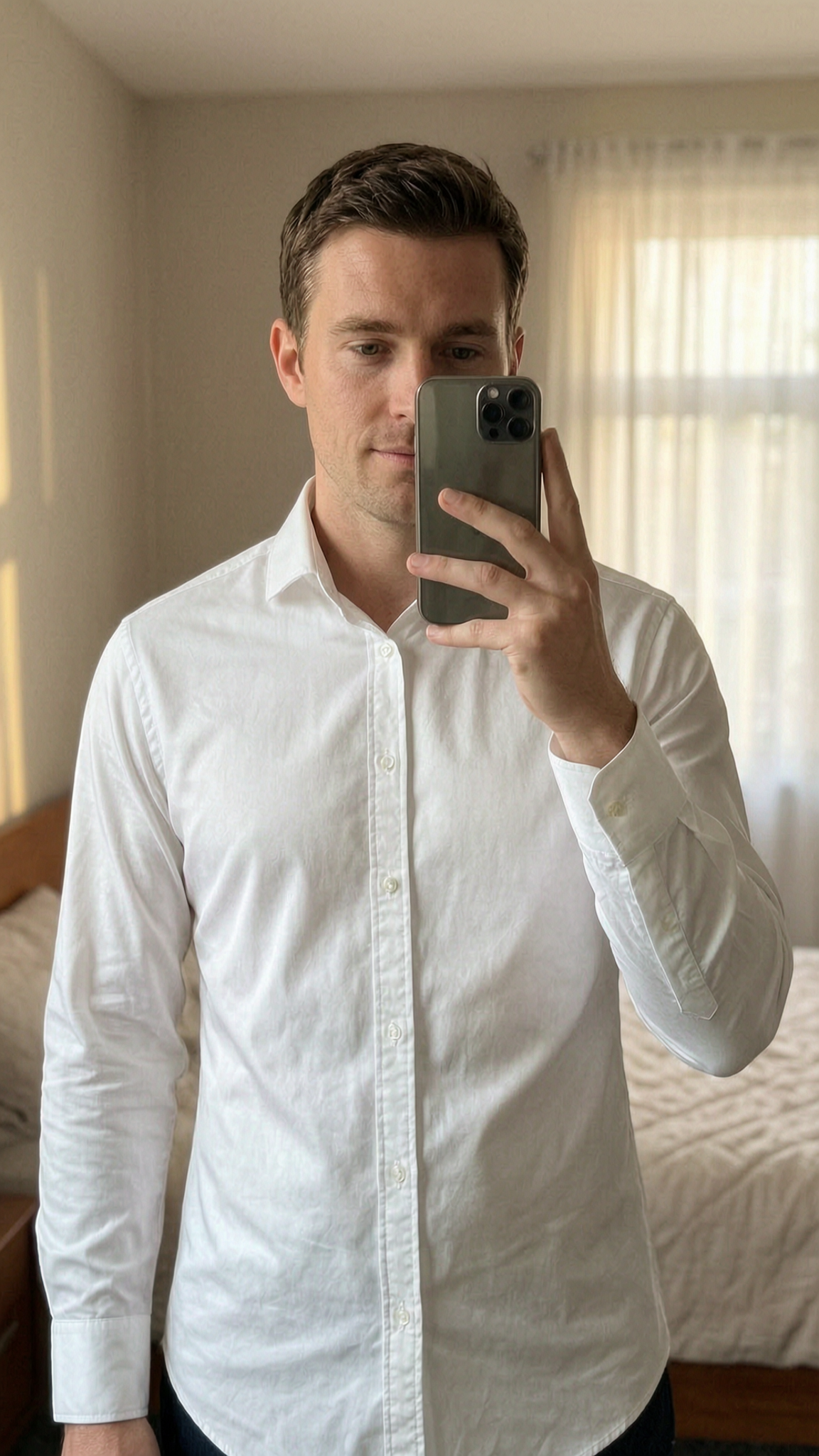 Men’s T.M.Lewin Luxury Slim Fit White Shirt standing straight facing the camera, in a softly lit bedroom setting, with gentle natural light filtering through a window.