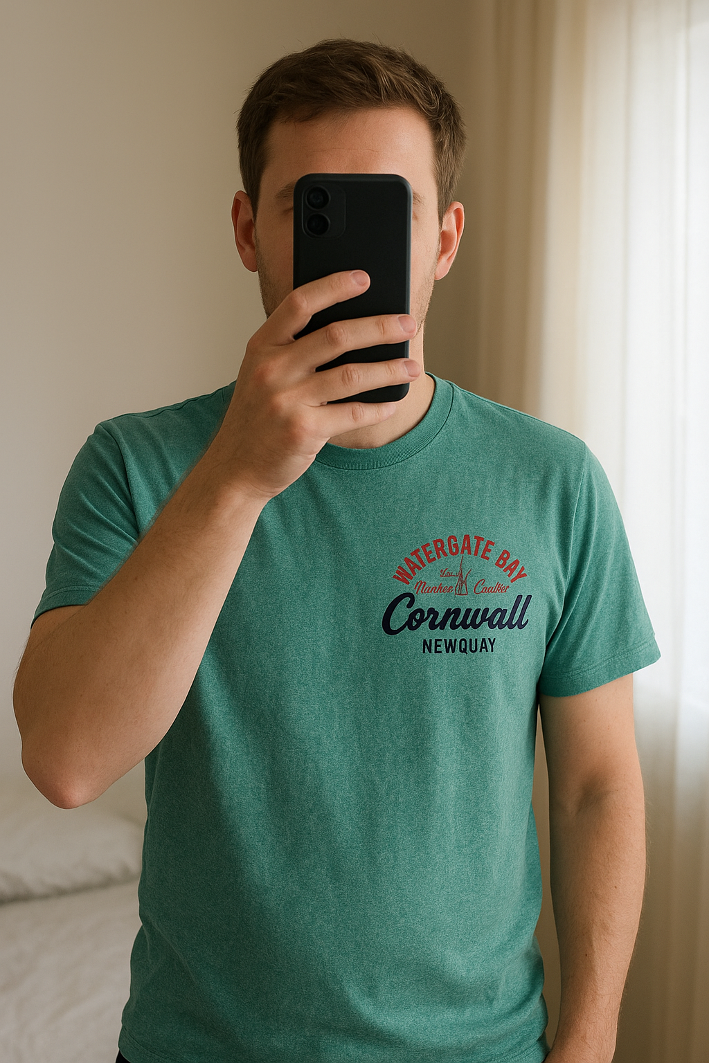 Men’s T-shirt standing straight facing the camera, in a softly lit bedroom setting, with gentle natural light filtering through a window.