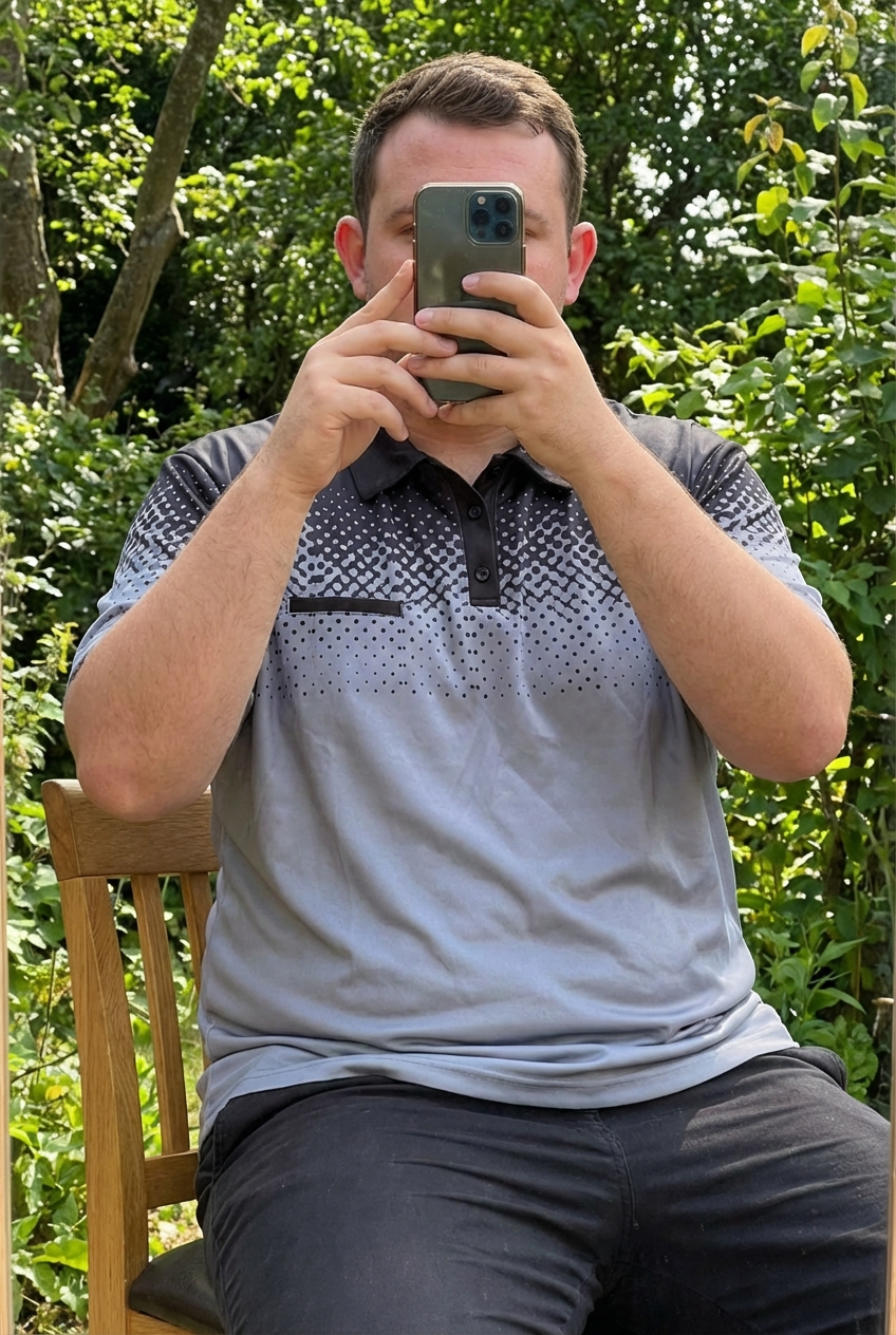 A person in Men’s XL grey & black sports polo shirt sitting on a high chair, with a relaxed posture, with a slightly curvier body type, outdoors in a natural setting, surrounded by greenery and soft daylight.