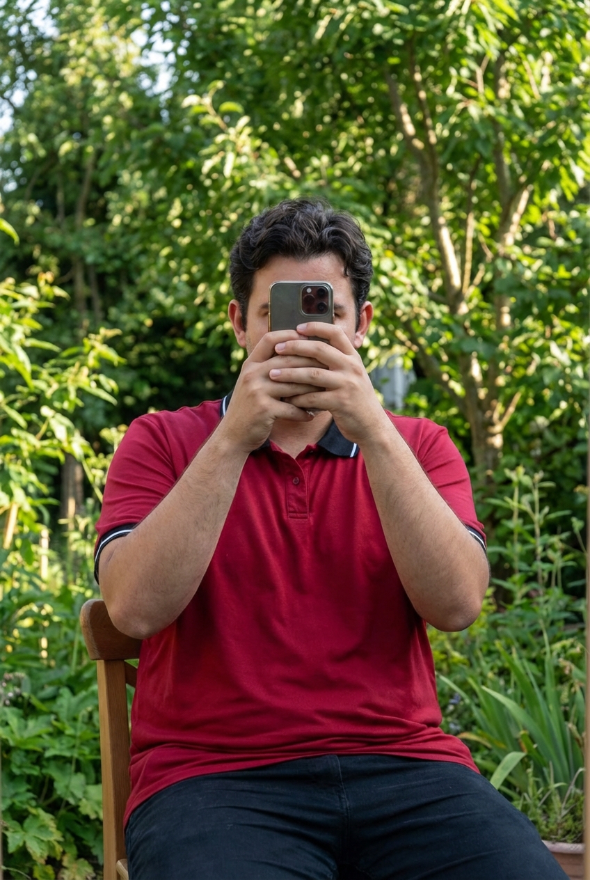 A person in Men’s XL polo shirt sitting on a high chair, with a relaxed posture, with a slightly curvier body type, outdoors in a natural setting, surrounded by greenery and soft daylight.