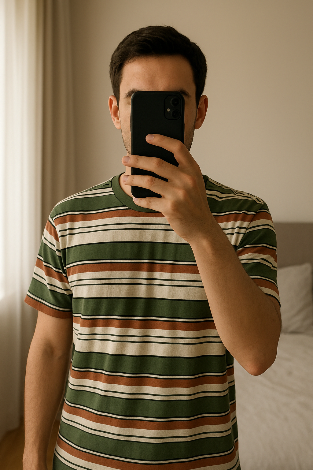 Mens Asda T-shirt standing straight facing the camera, in a softly lit bedroom setting, with gentle natural light filtering through a window.