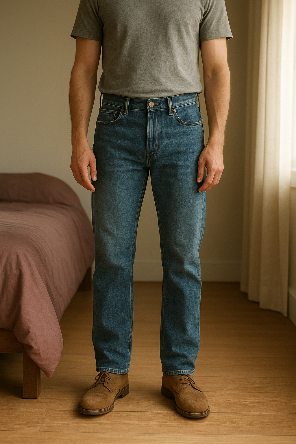 Mens Next Jeans 36 waist 31 leg standing straight facing the camera, in a softly lit bedroom setting, with gentle natural light filtering through a window.