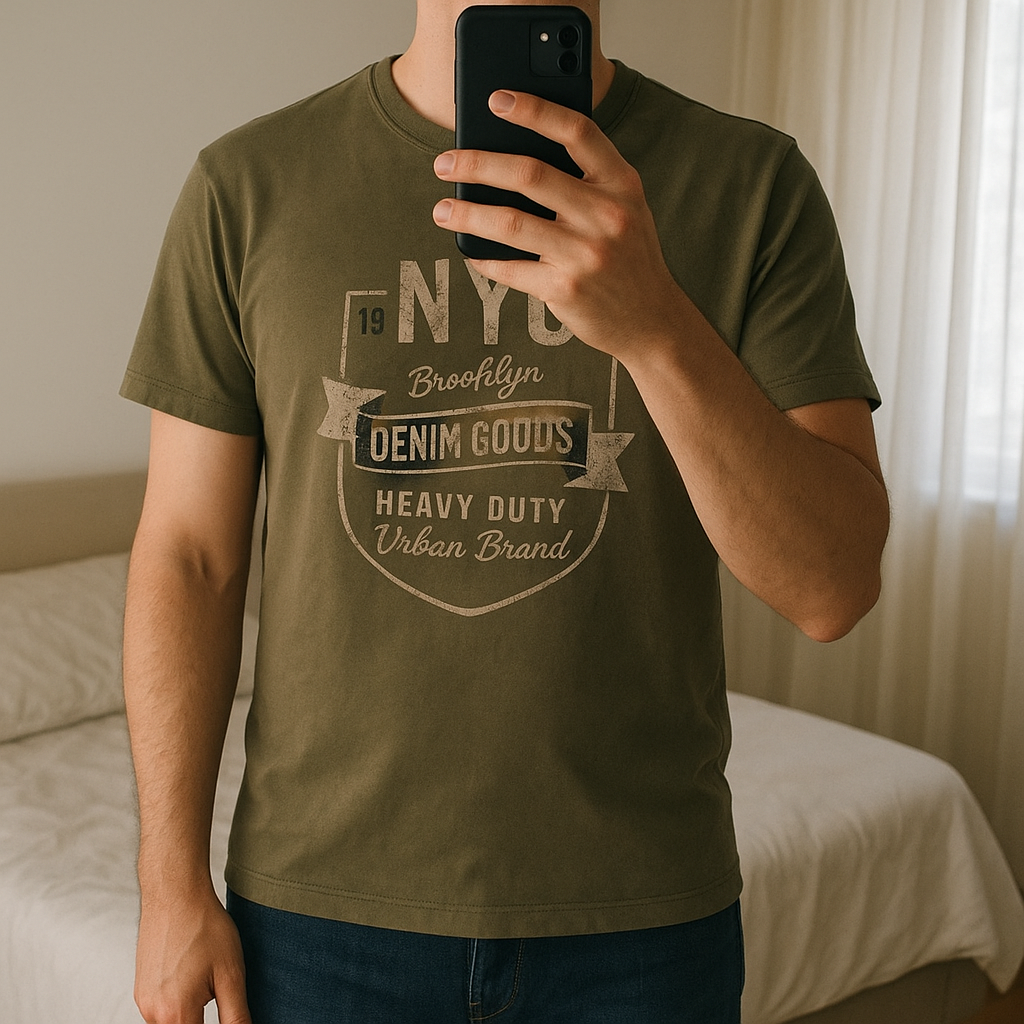 Mens T shirt standing straight facing the camera, in a softly lit bedroom setting, with gentle natural light filtering through a window.