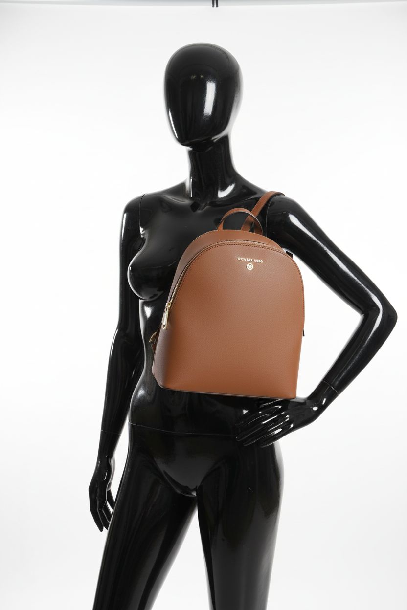 a glossy black plastic mannequin with no facial features in Micheal Kors Structured Tan Medium Size Backpack arching their back slightly for a dynamic pose, in a clean photo studio with seamless white backdrop and softbox lighting.