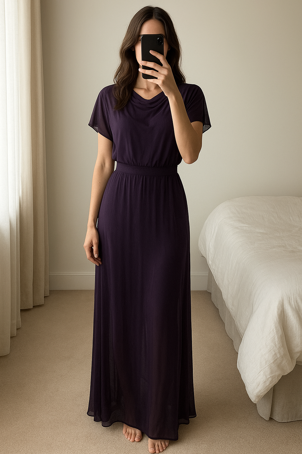 Michelle Keegan sheer wide leg jumpsuit purple size 12 new with tags standing straight facing the camera, in a softly lit bedroom setting, with gentle natural light filtering through a window.