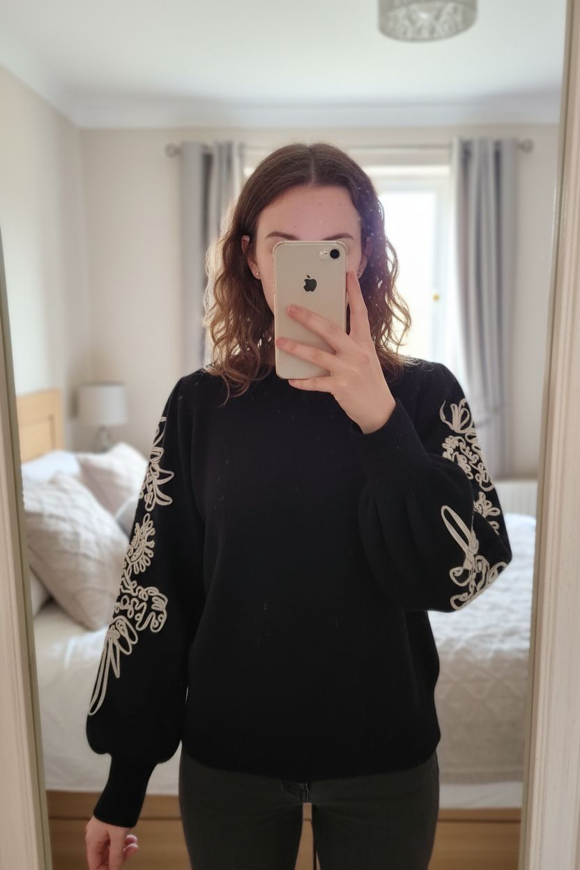Midnight Charm Jumper - Size 8-10 standing straight facing the camera, in a softly lit bedroom setting, with gentle natural light filtering through a window.