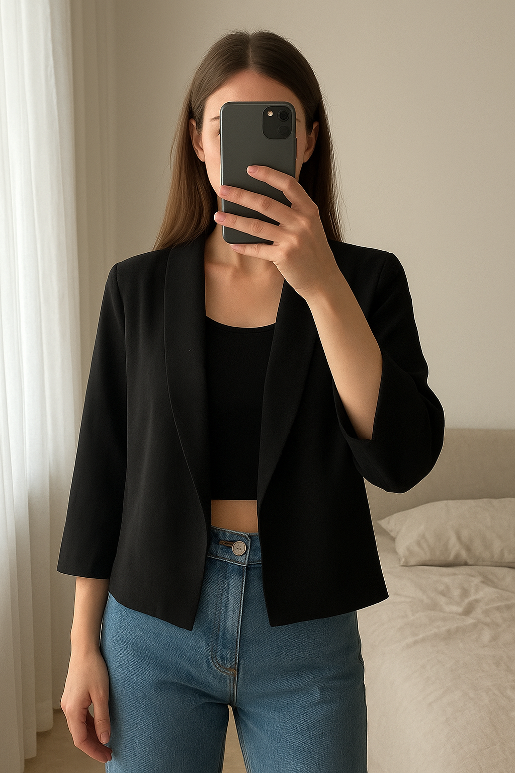 Mini blazer prettylittlething debout, face à la caméra, dans une chambre à la lumière douce, avec une lumière naturelle filtrant par la fenêtre.