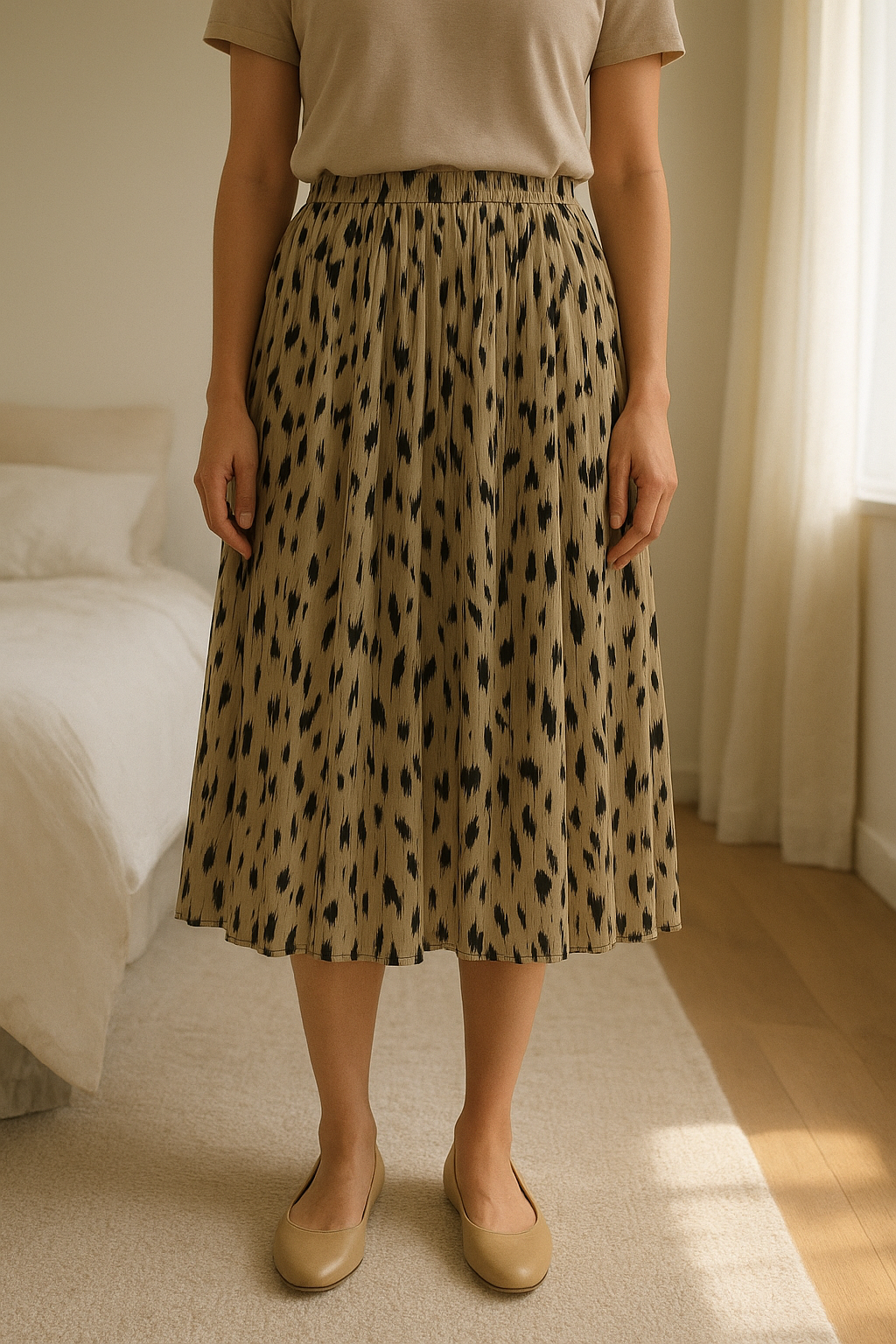 Minigonna a pieghe con elastico taglia S in piedi, rivolto verso la fotocamera, in una camera da letto con luce soffusa e luce naturale che filtra dalla finestra.