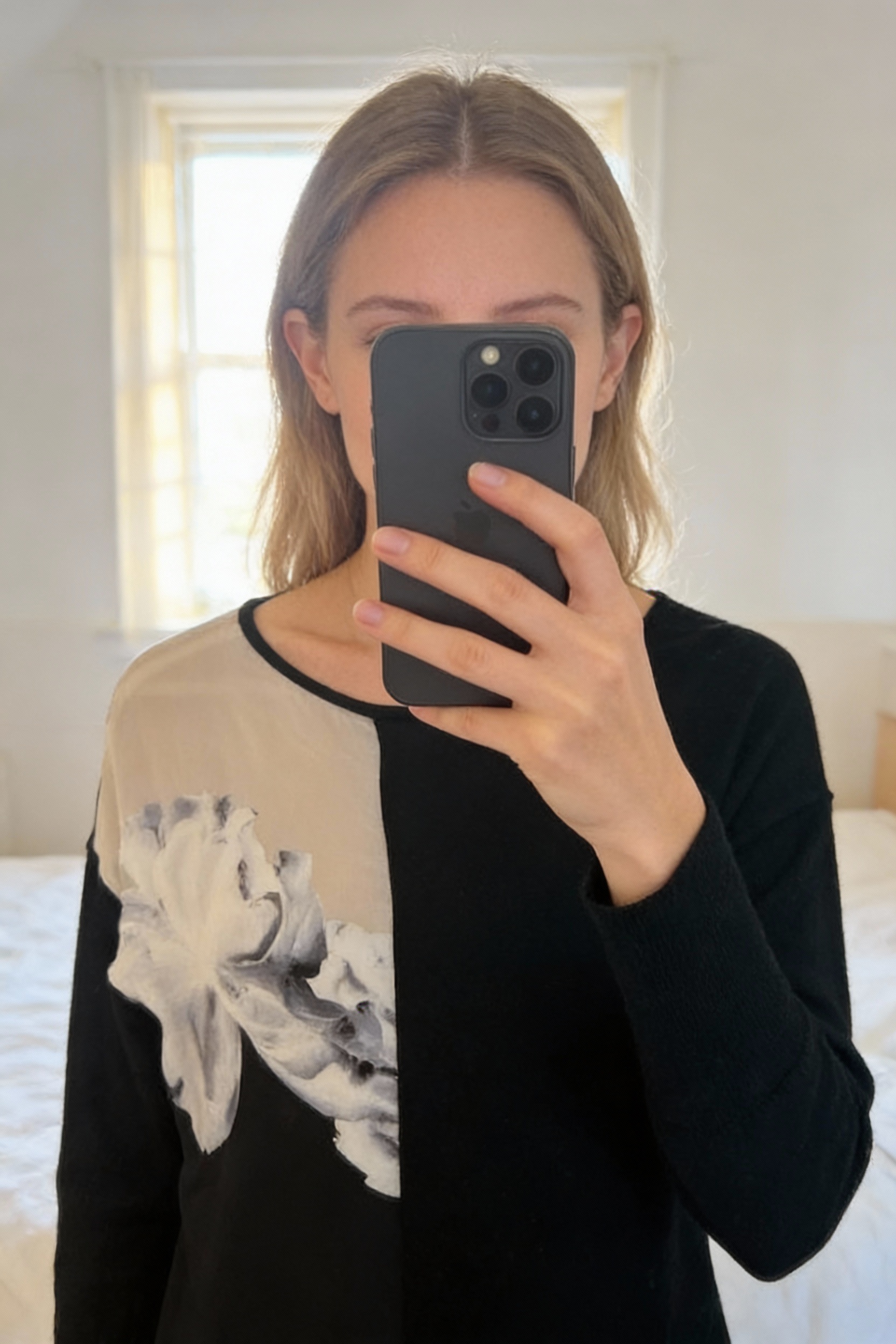 Mint Velvet 100% Merino Wool Jumper Black/Grey Floral Sheer - Size 12 standing straight facing the camera, in a softly lit bedroom setting, with gentle natural light filtering through a window.