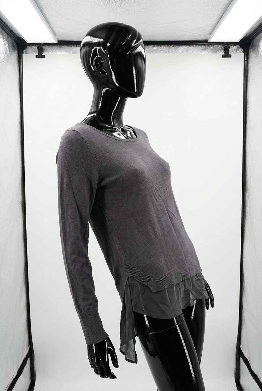 a glossy black plastic mannequin with no facial features in Mint Velvet Dark Grey Asymmetrical Jumper Size 14 arching their back slightly for a dynamic pose, in a clean photo studio with seamless white backdrop and softbox lighting.