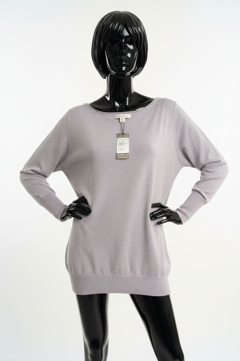 a glossy black plastic mannequin with no facial features in Mint Velvet Size 18 Lilac / Grey Jumper arching their back slightly for a dynamic pose, in a clean photo studio with seamless white backdrop and softbox lighting.