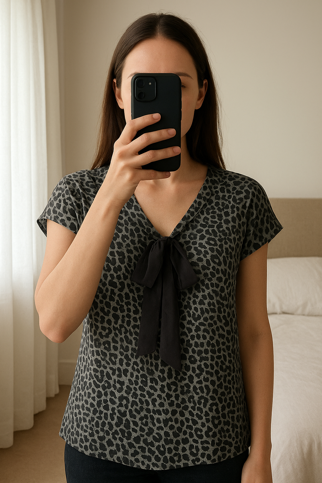 Mint Velvet top - size 10 - as new standing straight facing the camera, in a softly lit bedroom setting, with gentle natural light filtering through a window.