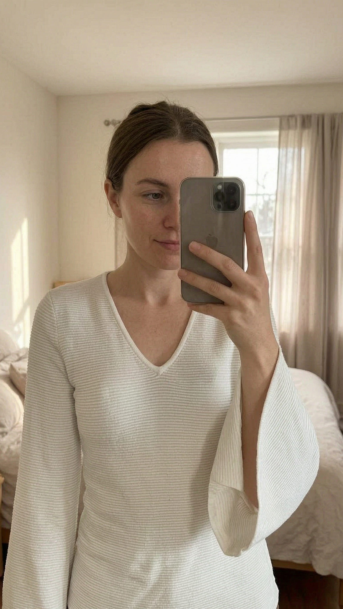 A person in Mint Velvet winter white ribbed long sleeved v-neck top size 12 standing straight facing the camera, in a softly lit bedroom setting, with gentle natural light filtering through a window.
