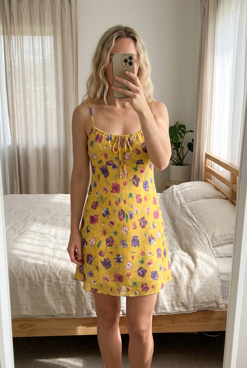 Miss Selfridge Yellow Floral Cami Top – Size UK 10 – Tie Front – Summer/Y2K Style standing straight facing the camera, in a softly lit bedroom setting, with gentle natural light filtering through a window.