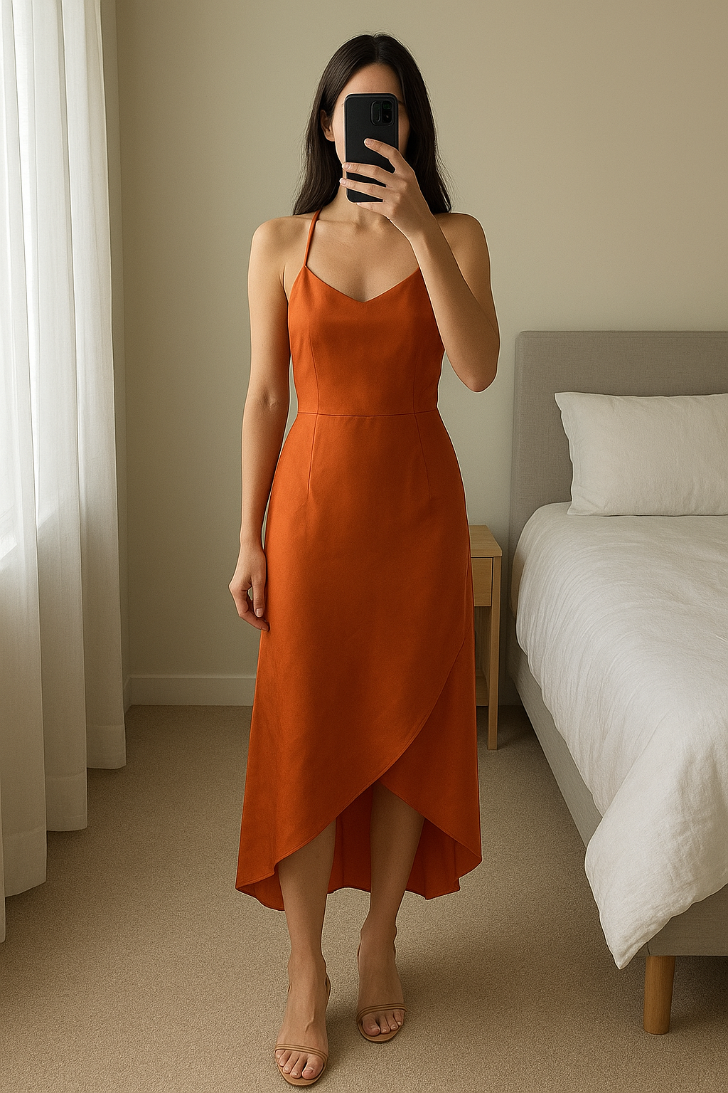 Missguided occasion dress standing straight facing the camera, in a softly lit bedroom setting, with gentle natural light filtering through a window.