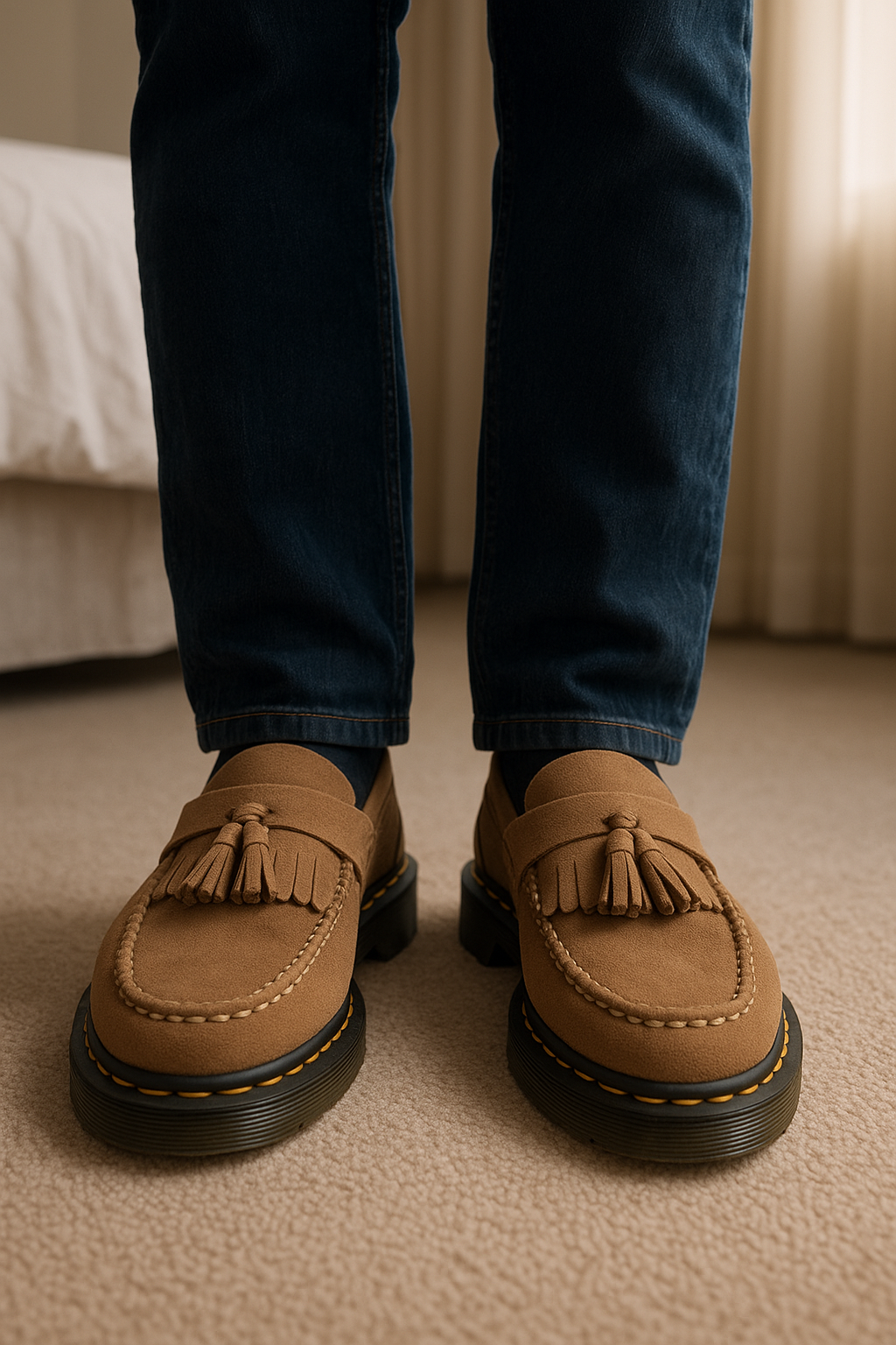 Mocassins Dr Marteens debout, face à la caméra, dans une chambre à la lumière douce, avec une lumière naturelle filtrant par la fenêtre.