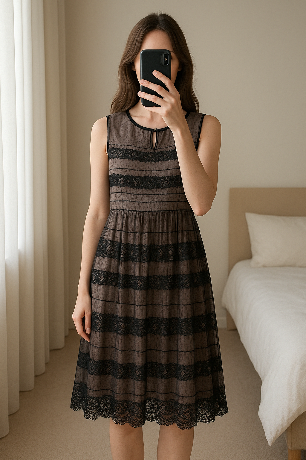 Monsoon Black Beaded Dress Size 16 standing straight facing the camera, in a softly lit bedroom setting, with gentle natural light filtering through a window.