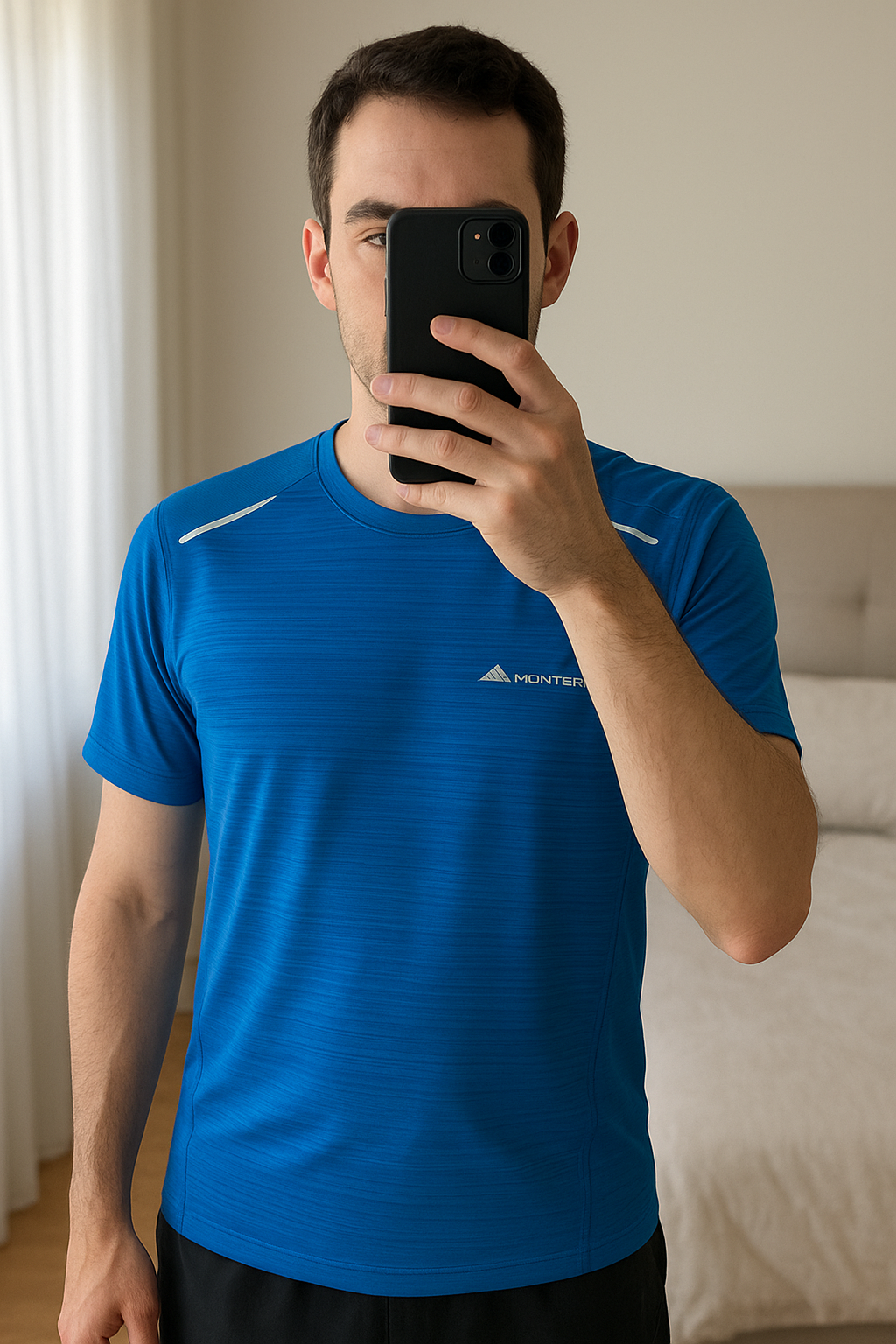 Monterrain Men’s Blue T’Shirt standing straight facing the camera, in a softly lit bedroom setting, with gentle natural light filtering through a window.