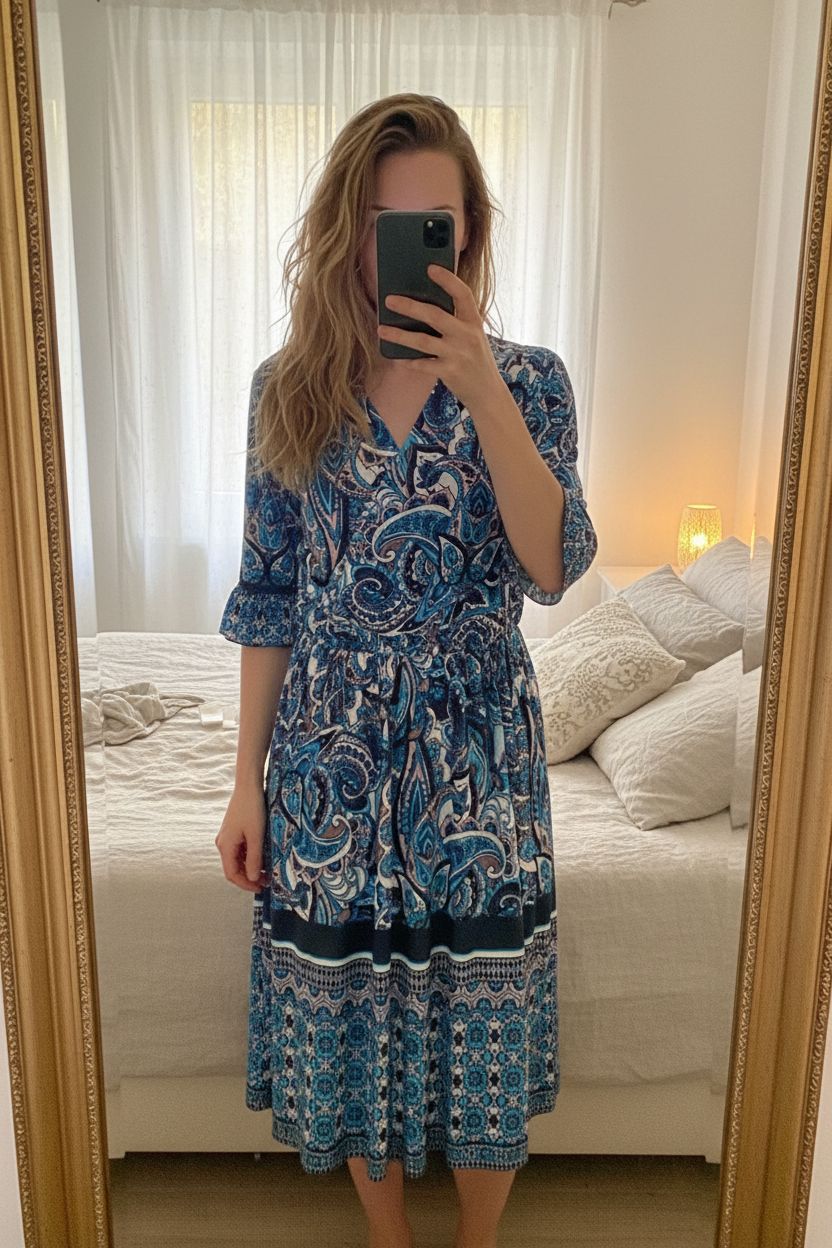 Mosquito blue paisley midi dress size M boho wrap style standing straight facing the camera, in a softly lit bedroom setting, with gentle natural light filtering through a window.
