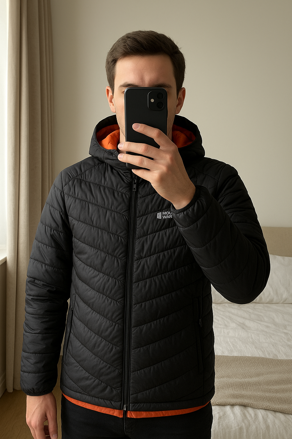 🗻 Mountain Warehouse Mens Small Reversible Jacket Lightweight Excellent condition standing straight facing the camera, in a softly lit bedroom setting, with gentle natural light filtering through a window.