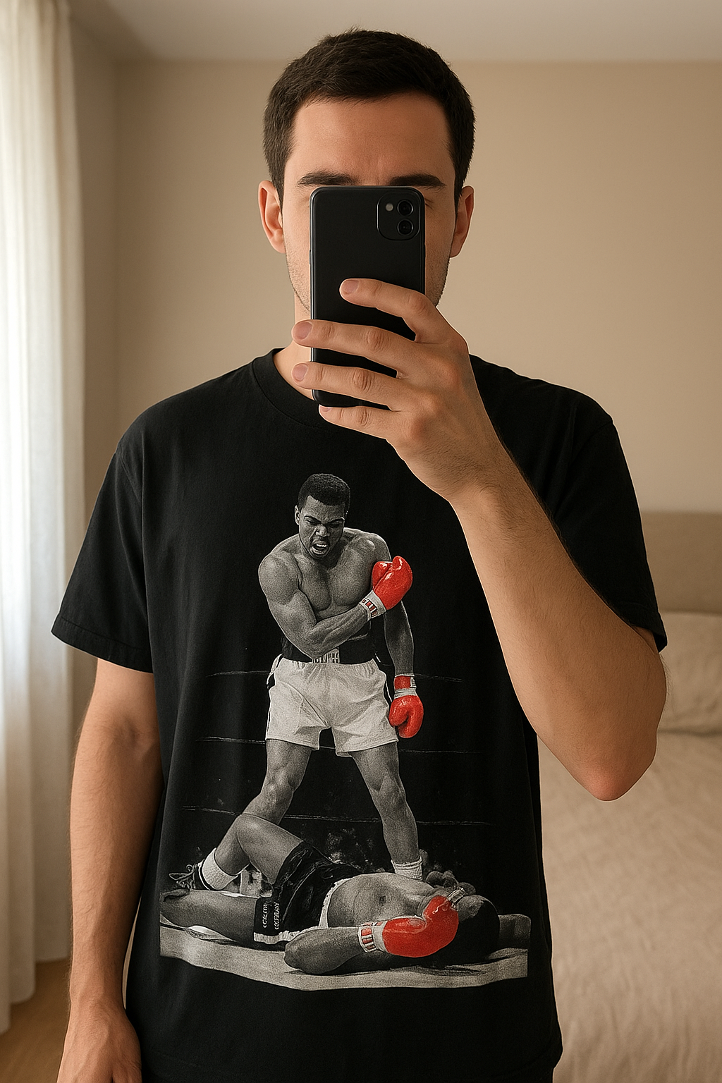 Muhammad ALI black tshirt size XXL standing straight facing the camera, in a softly lit bedroom setting, with gentle natural light filtering through a window.