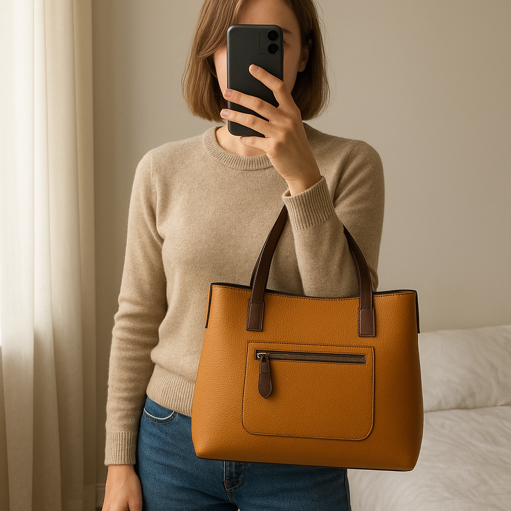 Mustard and tan handbag standing straight facing the camera, in a softly lit bedroom setting, with gentle natural light filtering through a window.