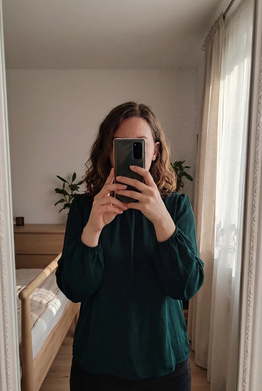 A person in Női ing, sötét zöld, tökéletes állapot, lenge anyag, L méret, EU 40/42 standing straight facing the camera, in a softly lit bedroom setting, with gentle natural light filtering through a window.