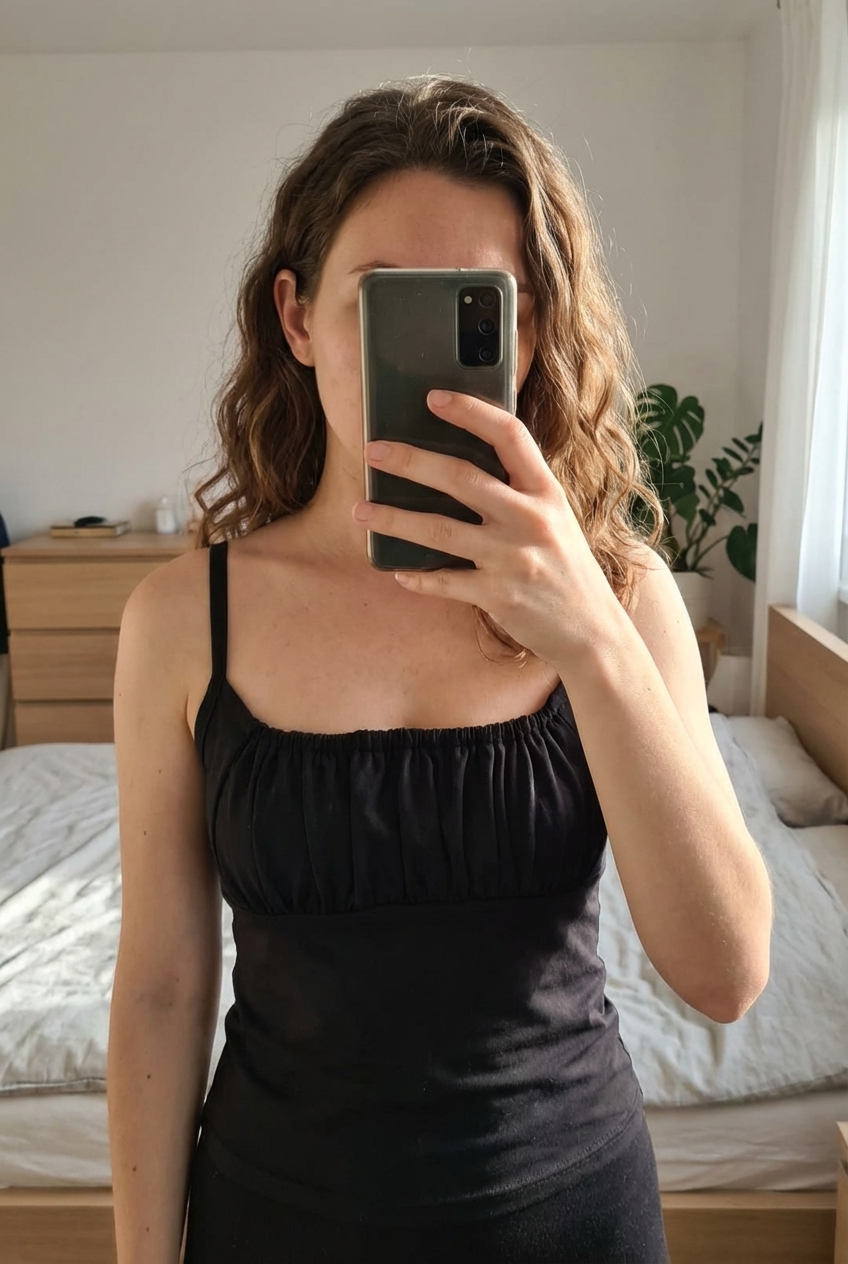 Női vintage style trikó standing straight facing the camera, in a softly lit bedroom setting, with gentle natural light filtering through a window.