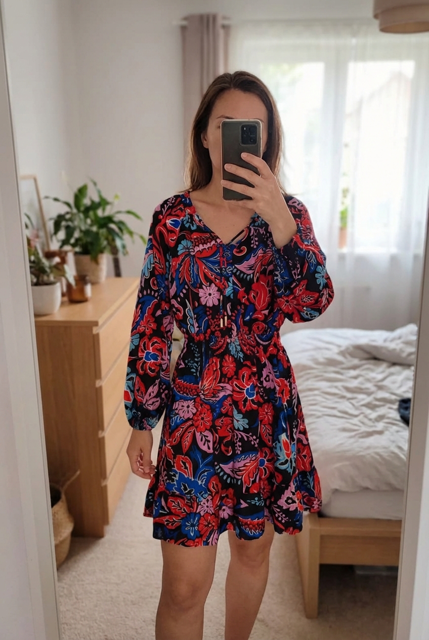 A person in Nagyon különleges, mintás, női ruha, hibátlan, M méret standing straight facing the camera, in a softly lit bedroom setting, with gentle natural light filtering through a window.