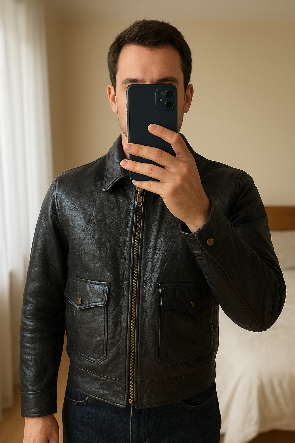 Napoline 100% Real Leather Outfitters Men's Black Handcrafted Patchwork Leather Jacket - XL standing straight facing the camera, in a softly lit bedroom setting, with gentle natural light filtering through a window.