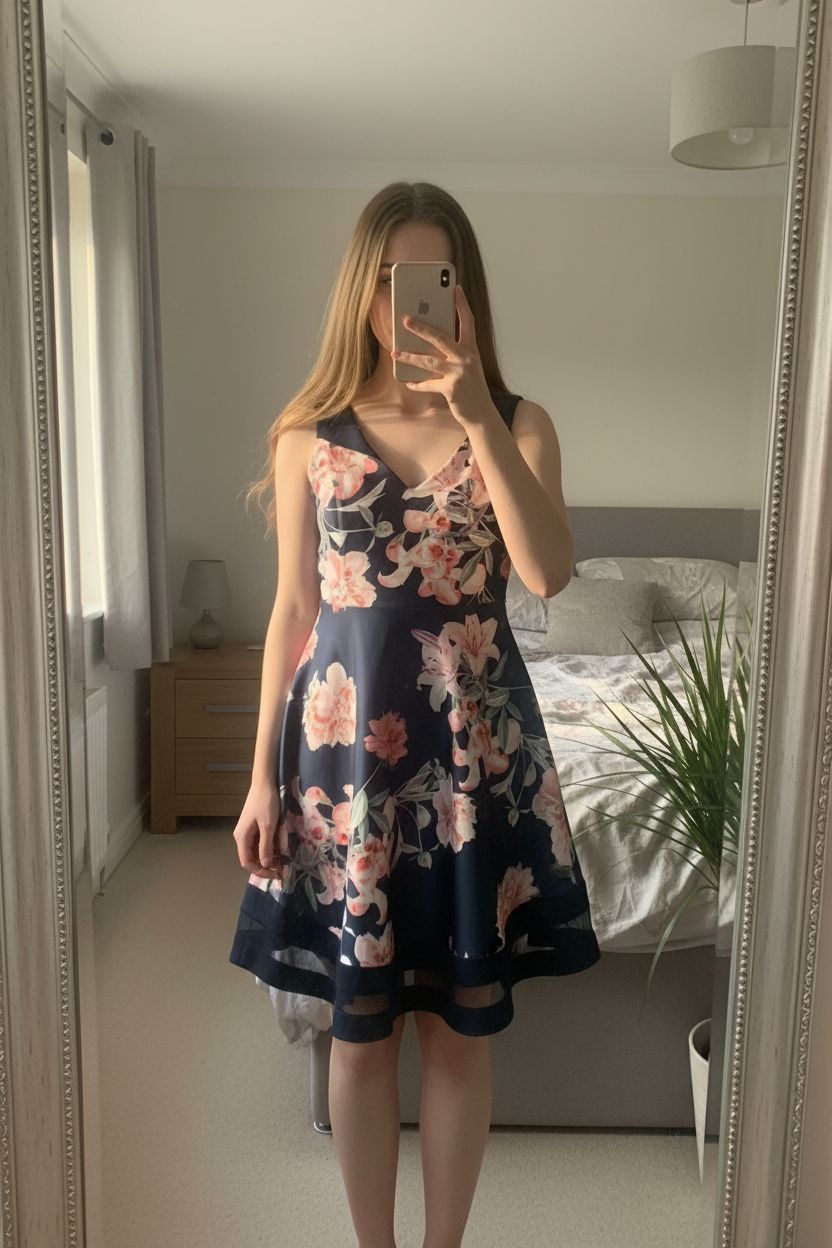 Navy floral dress standing straight facing the camera, in a softly lit bedroom setting, with gentle natural light filtering through a window.