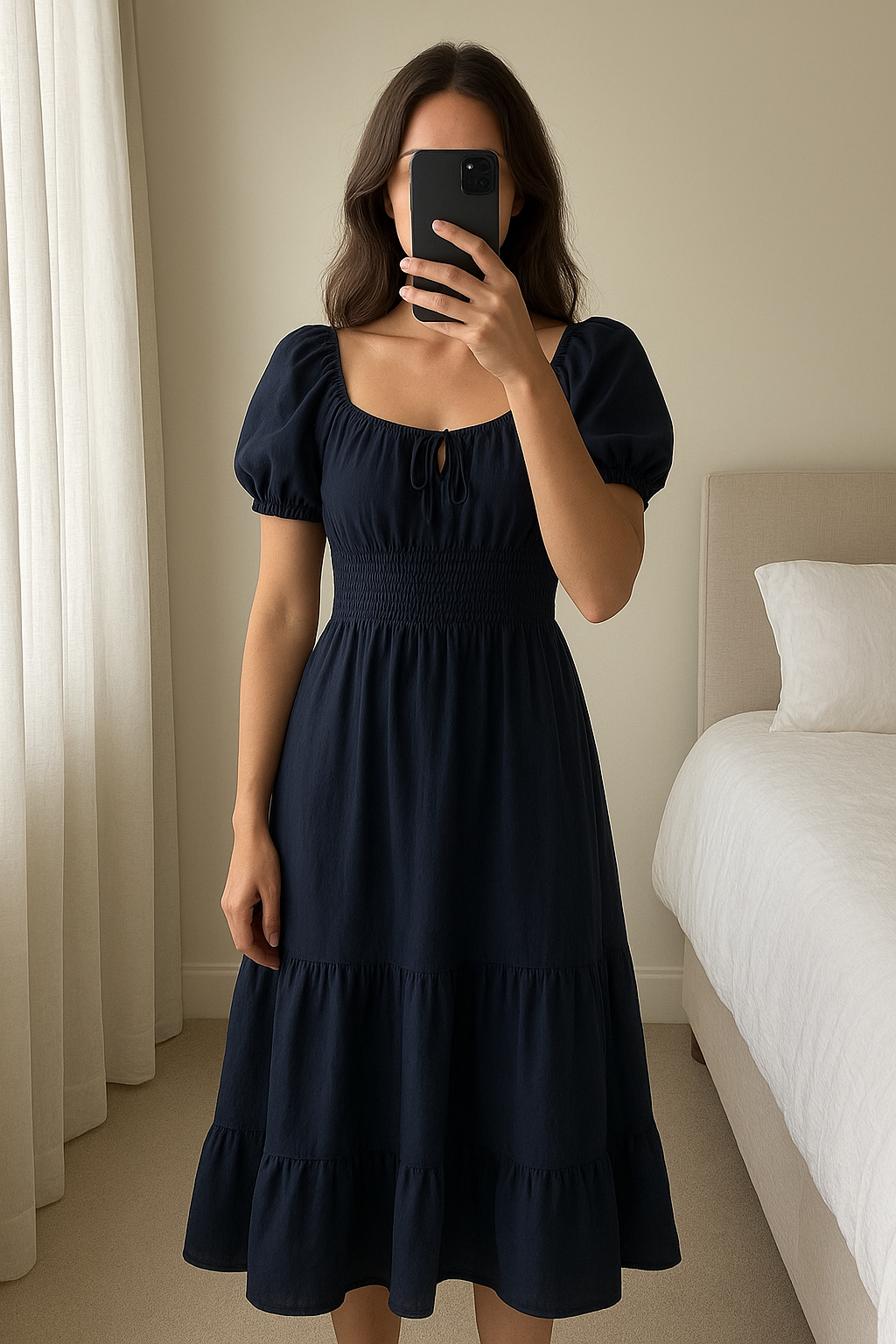 🩵 Navy Puff Sleeve Smocked Dress (XXL) standing straight facing the camera, in a softly lit bedroom setting, with gentle natural light filtering through a window.
