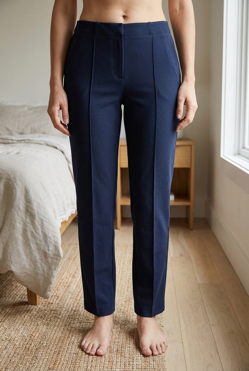 Navy Viscose Straight Leg Formal Trousers standing straight facing the camera, in a softly lit bedroom setting, with gentle natural light filtering through a window.