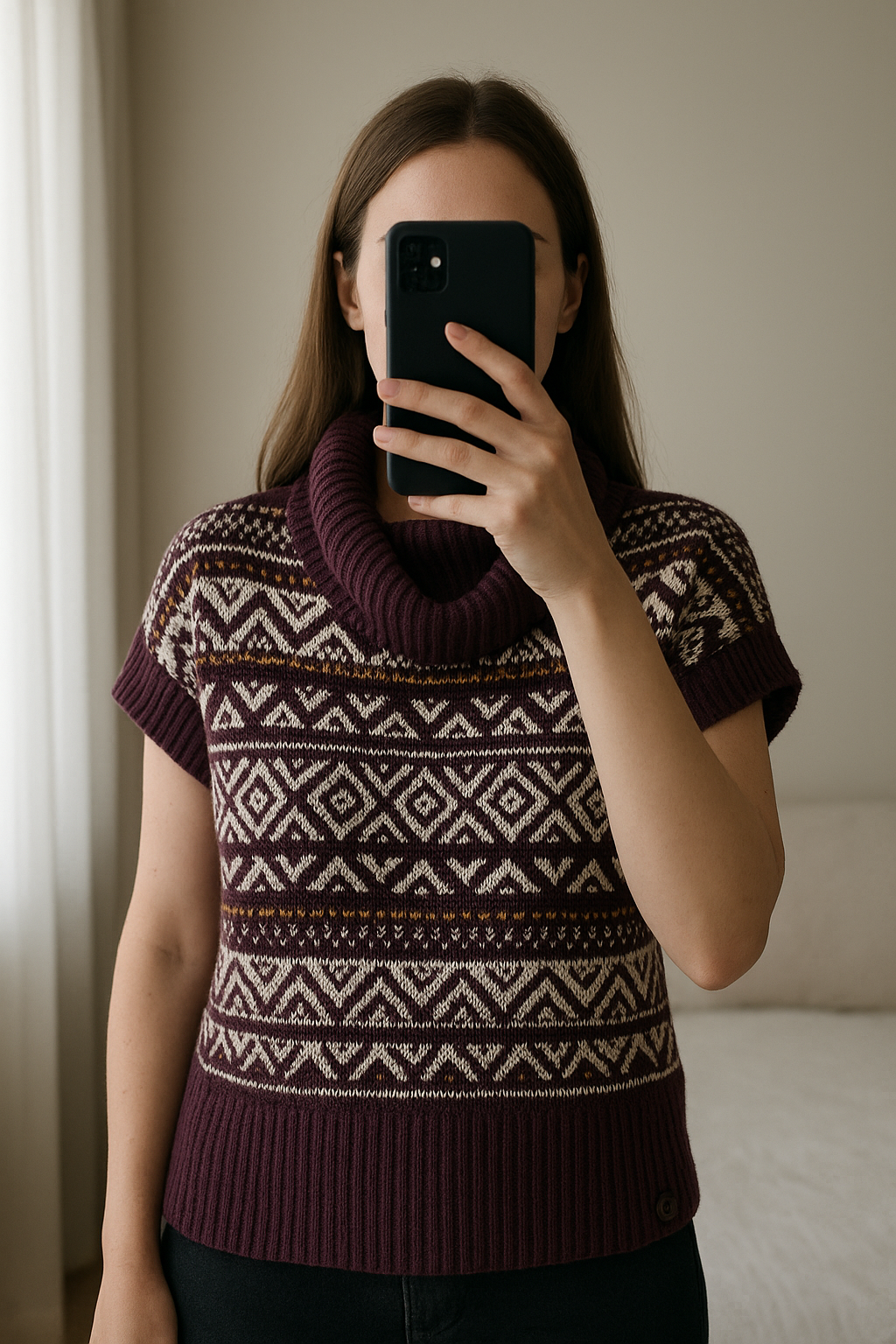 NEU Norweger Strick-Poncho Gr. L/ XL aufrecht stehend, der Kamera zugewandt, in einem sanft beleuchteten Schlafzimmer, mit natürlichem Licht, das durch ein Fenster fällt.