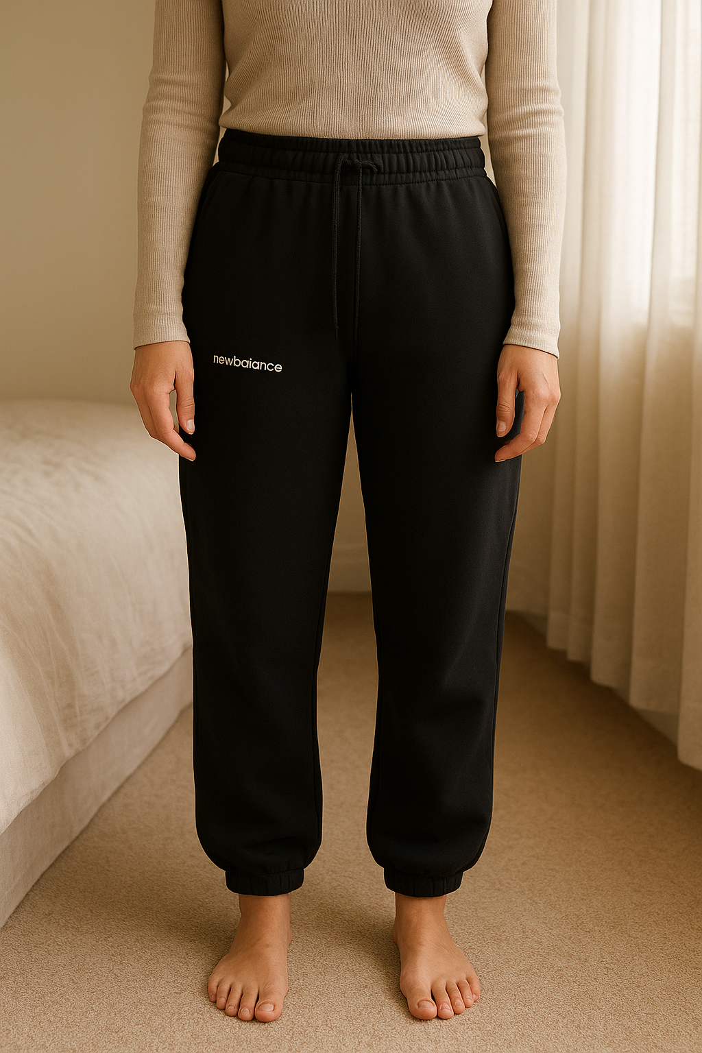 New Balance Women’s Black Jogging Set standing straight facing the camera, in a softly lit bedroom setting, with gentle natural light filtering through a window.