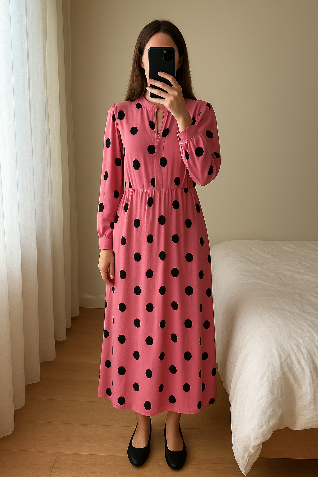 New Look Pink Polka Dot Maxi Dress – UK 20 – BNWT - Party standing straight facing the camera, in a softly lit bedroom setting, with gentle natural light filtering through a window.