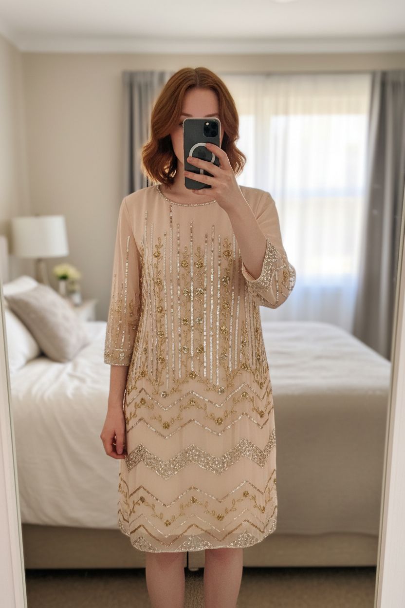 New Look Sequin Embellished Tunic Dress Nude Gold UK16 Party Y2K Original standing straight facing the camera, in a softly lit bedroom setting, with gentle natural light filtering through a window.