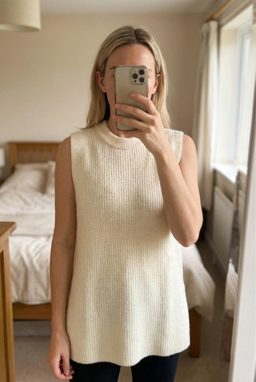 New look think top standing straight facing the camera, in a softly lit bedroom setting, with gentle natural light filtering through a window.