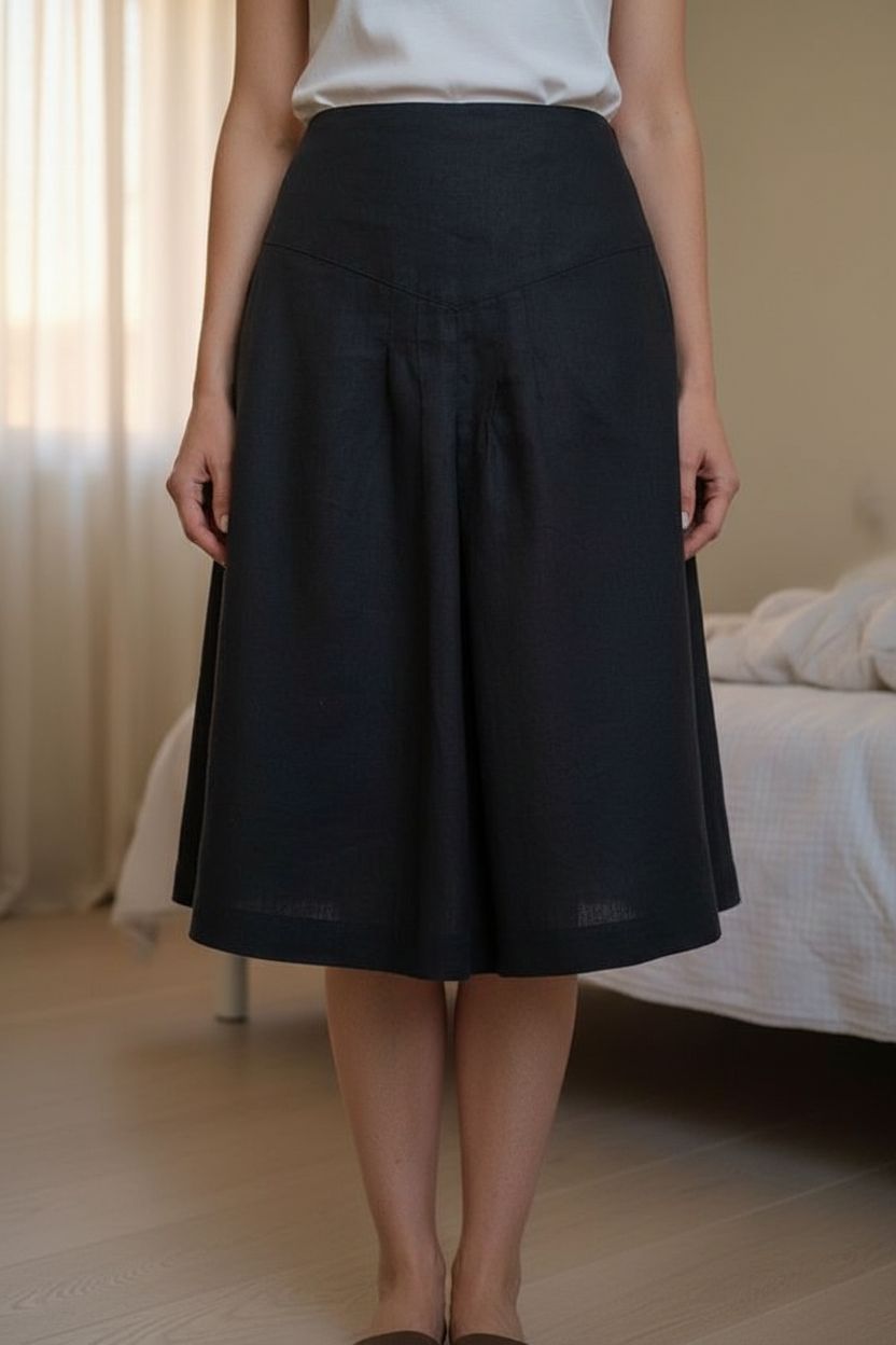 New summer skirt Benetton 100% linen debout, face à la caméra, dans une chambre à la lumière douce, avec une lumière naturelle filtrant par la fenêtre.