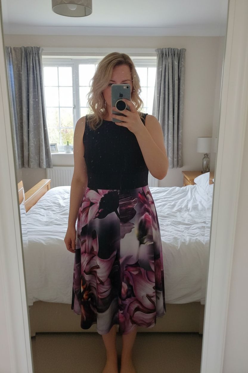 New with tags Joanna Hope dress, size 22 standing straight facing the camera, in a softly lit bedroom setting, with gentle natural light filtering through a window.