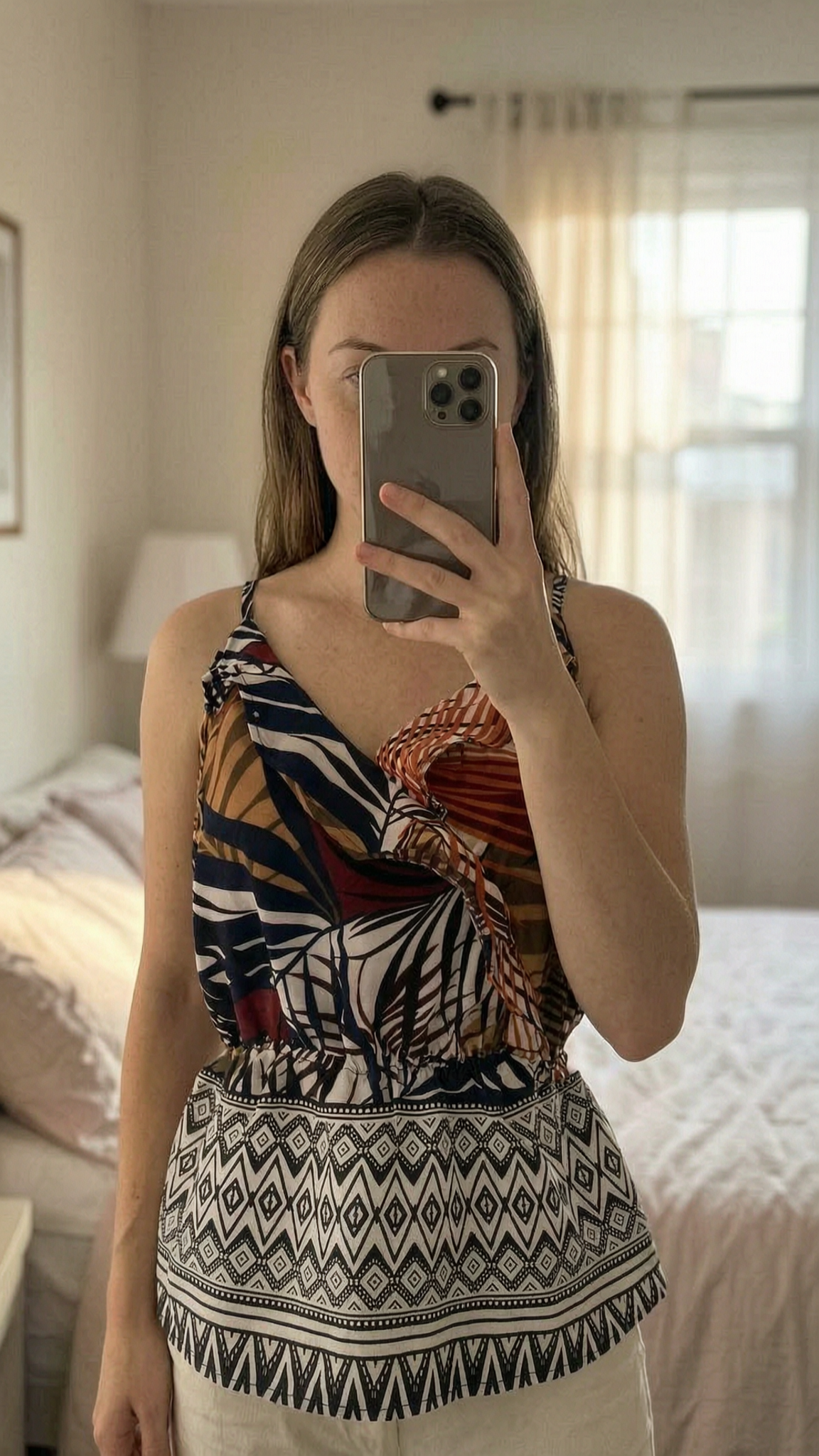 A person in New with tags summer strappy camisole vest with leaf & Aztec design size 12 standing straight facing the camera, in a softly lit bedroom setting, with gentle natural light filtering through a window.