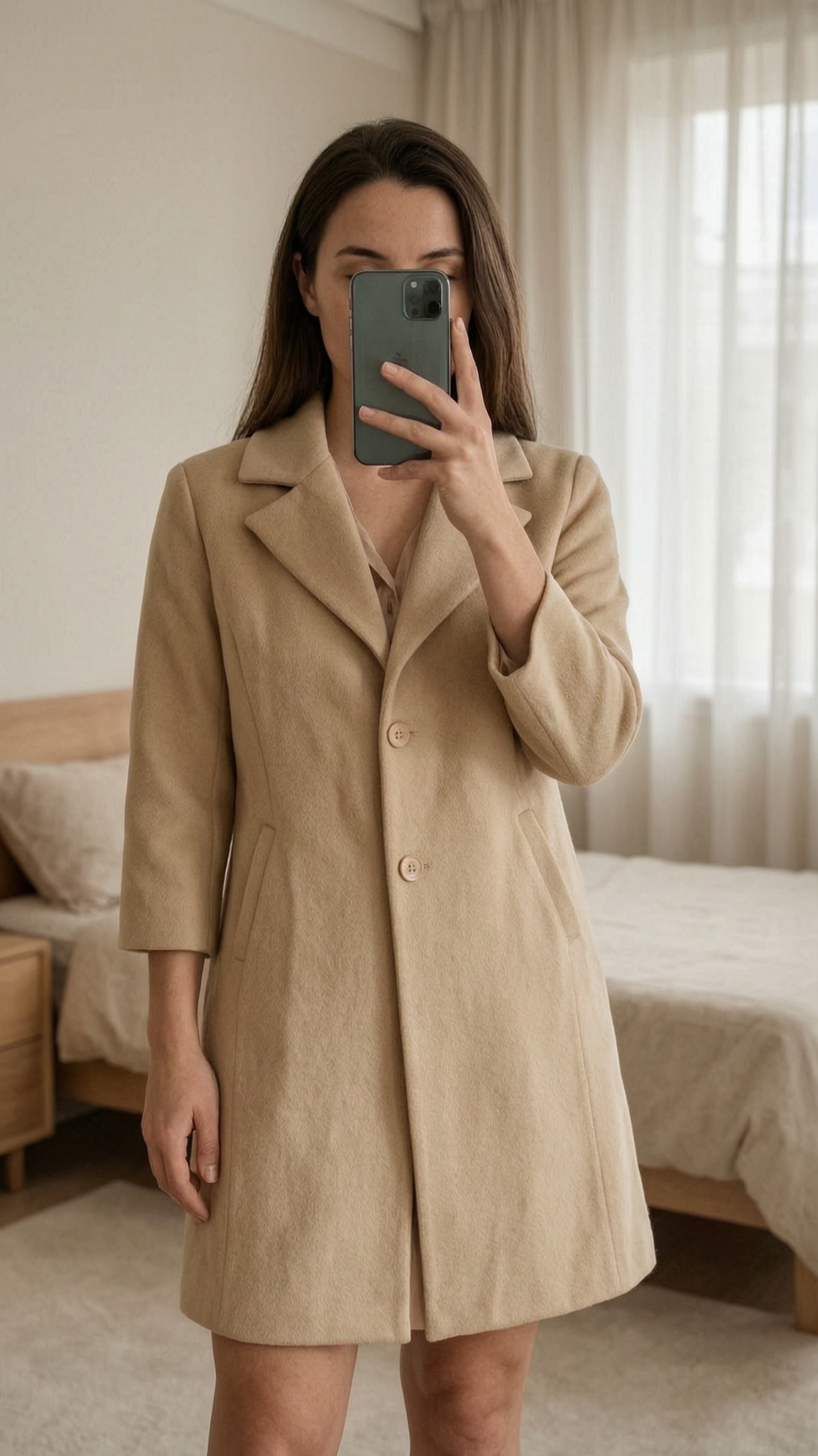 New Wool Coat Jacket | 3/4 Sleeves | Size S standing straight facing the camera, in a softly lit bedroom setting, with gentle natural light filtering through a window.