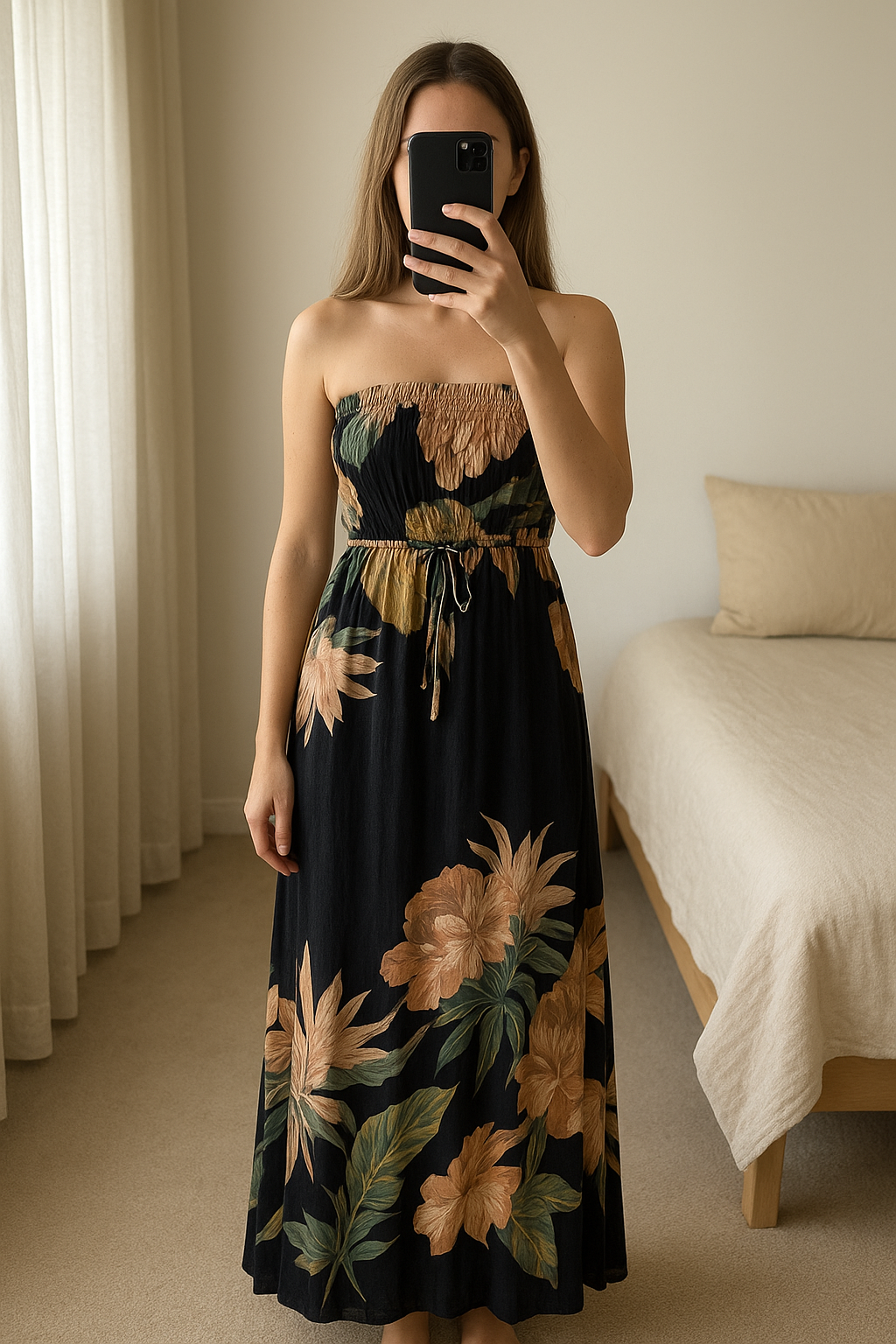 Next Beachwear floral strapless dress size 18 standing straight facing the camera, in a softly lit bedroom setting, with gentle natural light filtering through a window.