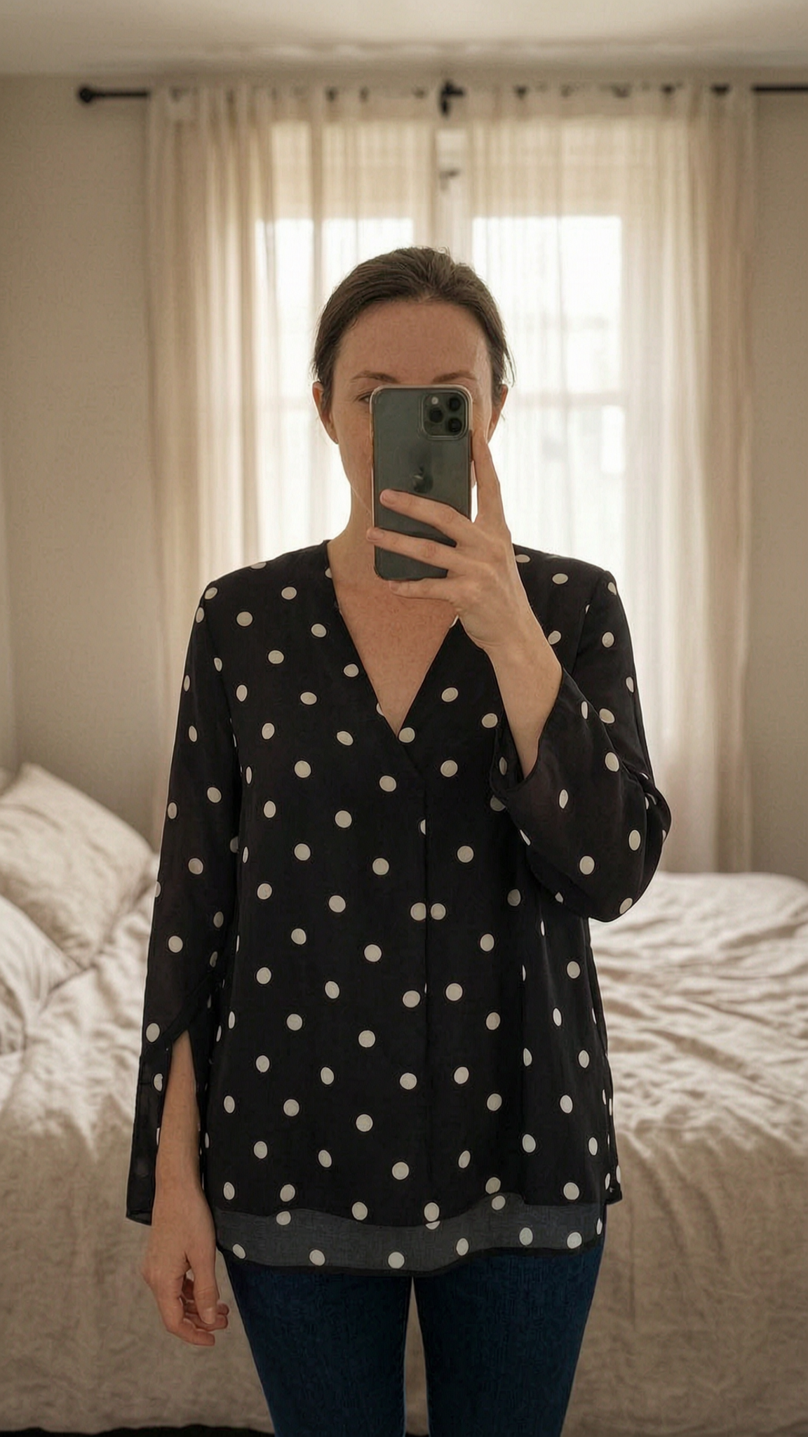Next Blouse - Black White Polka Dot - 14 standing straight facing the camera, in a softly lit bedroom setting, with gentle natural light filtering through a window.