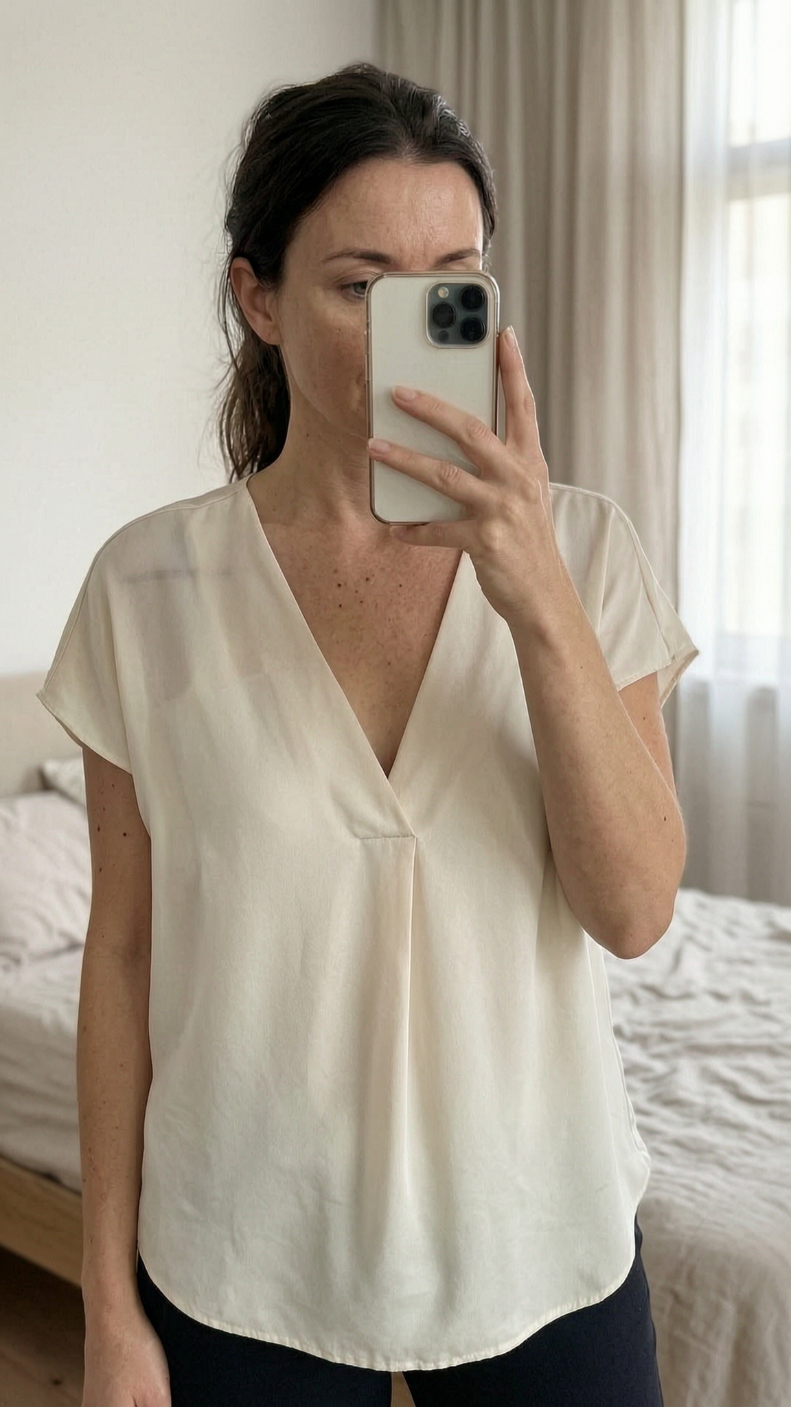 Next Blouse - Cream - 14 standing straight facing the camera, in a softly lit bedroom setting, with gentle natural light filtering through a window.
