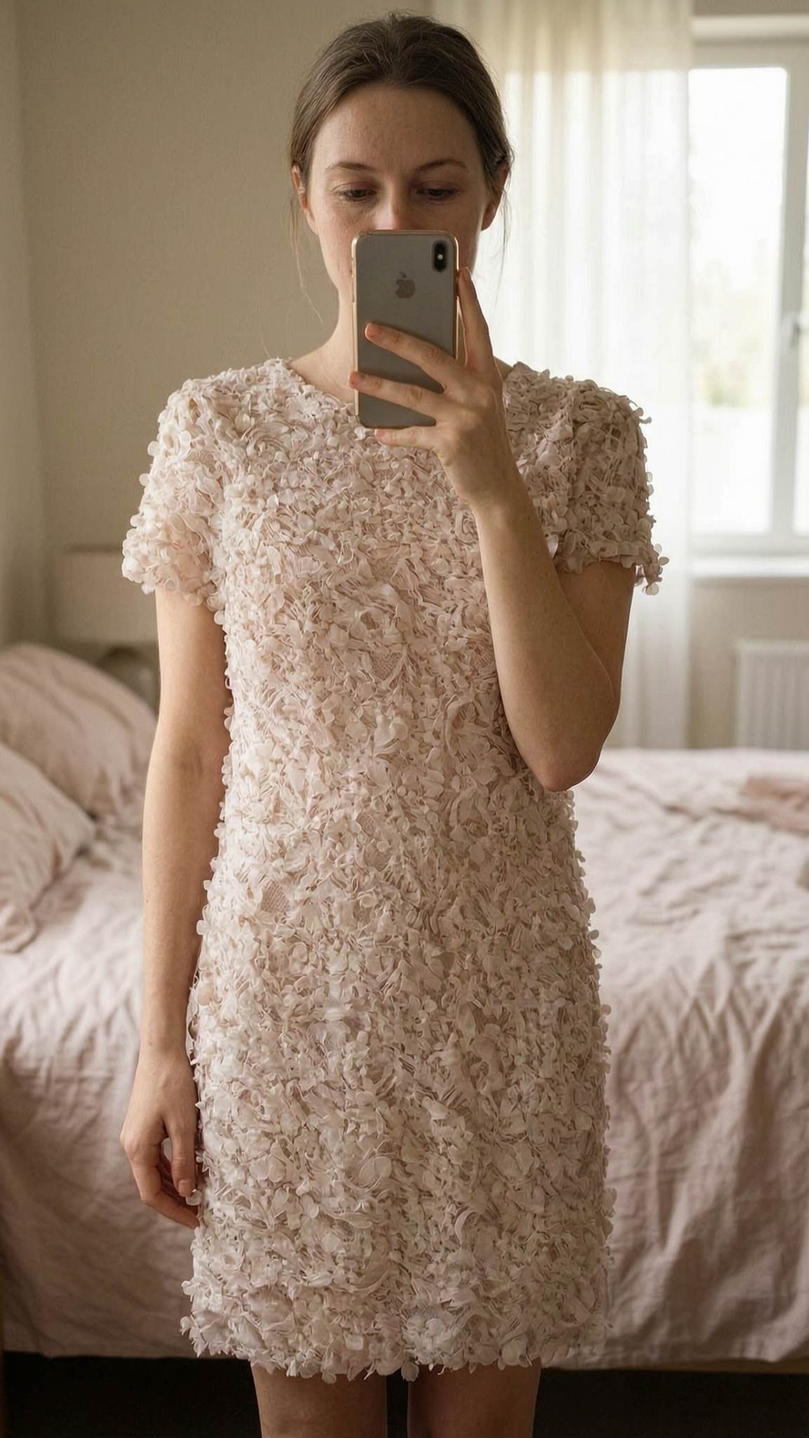 Next Blush Pink 3D Floral Textured Mini Dress Size 6 Elegant Occasion Dress standing straight facing the camera, in a softly lit bedroom setting, with gentle natural light filtering through a window.