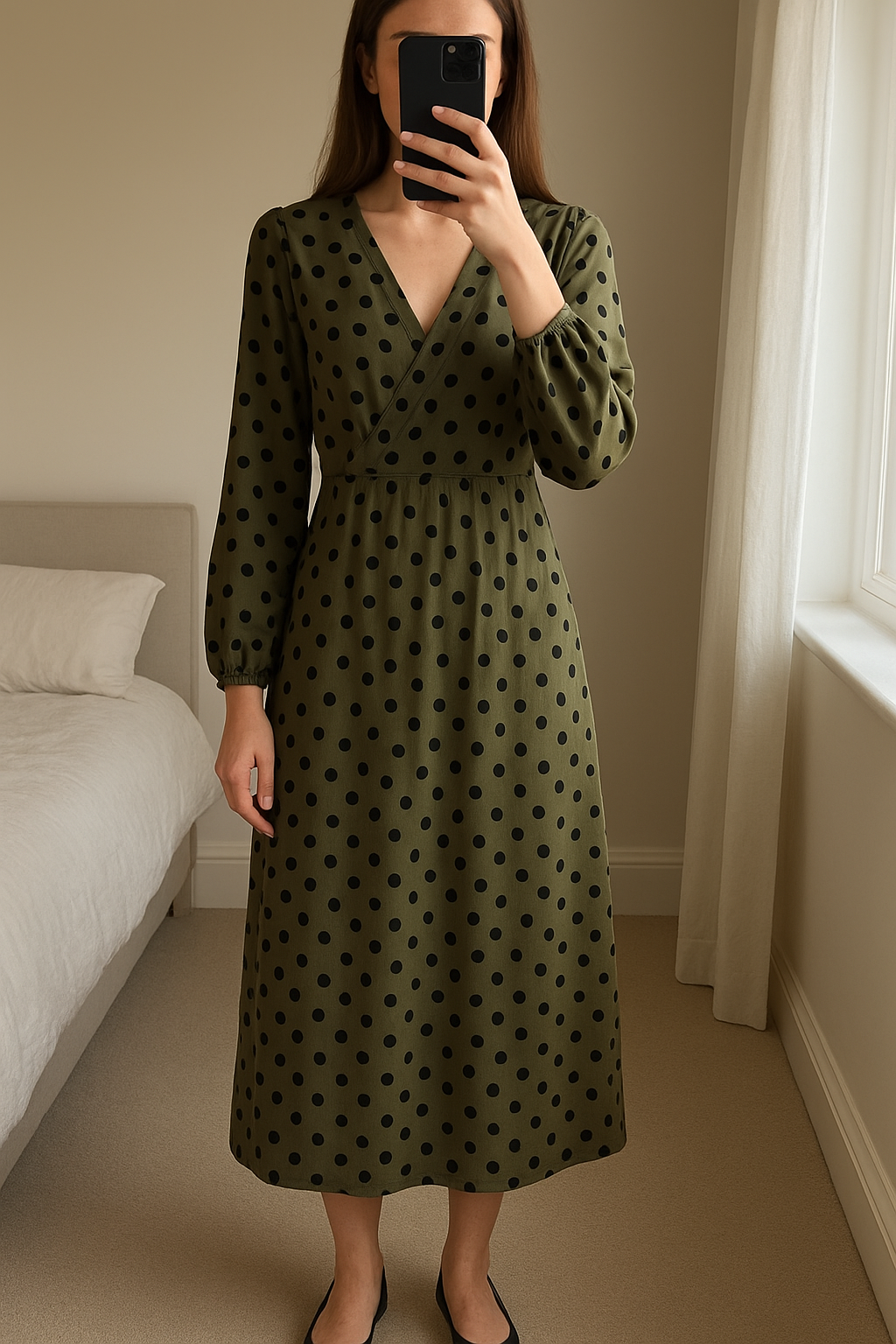Next dress size 18 standing straight facing the camera, in a softly lit bedroom setting, with gentle natural light filtering through a window.