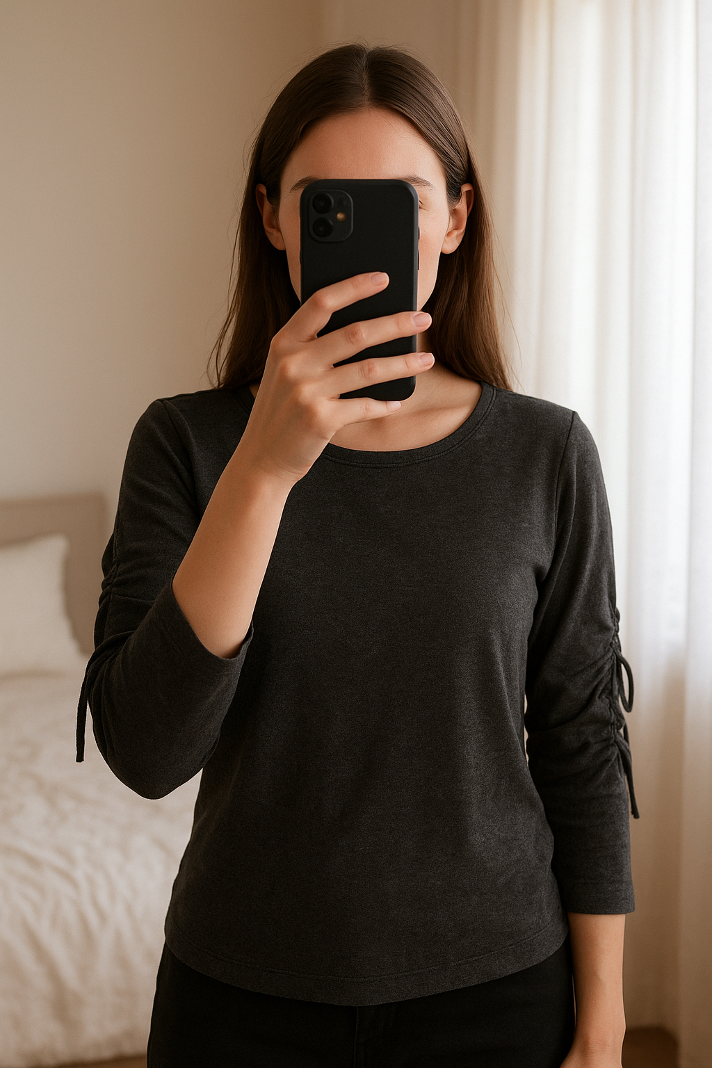 Next Grey Jumper size 18 standing straight facing the camera, in a softly lit bedroom setting, with gentle natural light filtering through a window.